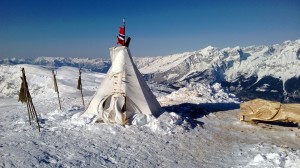 1 – Una tenda norvegese sulla vetta della Paganella (con pesce norvegese appeso ad essiccare)