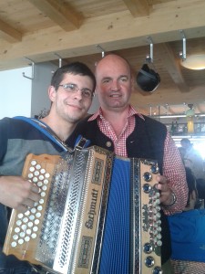 A pranzo … dove? Ci siamo fermati alla Teufelsegg Hutte, alla Baita della Seggiovia del Diavolo … a 2444 metri. Un ottimo piatto di gulasch ungherese con canederli a 8 euro. Molto bene!  Accanto a noi un ragazzo con la fisarmonica: detto fatto. Gli suggerisco Bergvagabunder, ed è subito festa. Molti si uniscono al coro. Chi è? Si tratta di Kevin Platzgummer, di Naturns. Bravo, Kevin! A noi si unisce il titolare della baita: foto ricordo. Consegno loro il biglietto del mio blog, con promessa di pubblicare un post.