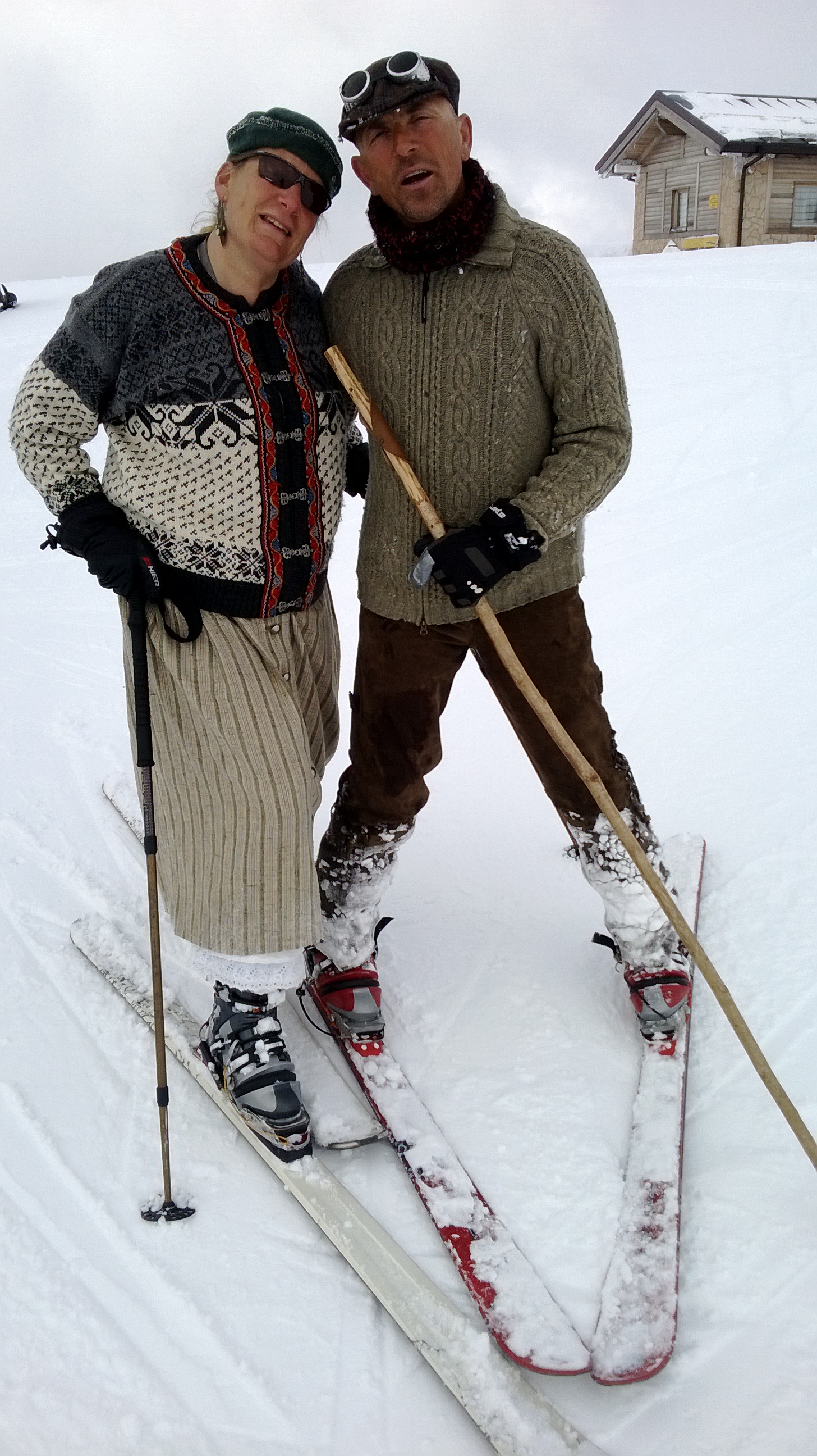 Risaliamo ed incontriamo due maestri di sci vestiti come di sti ani, cioè come tanti anni fa.