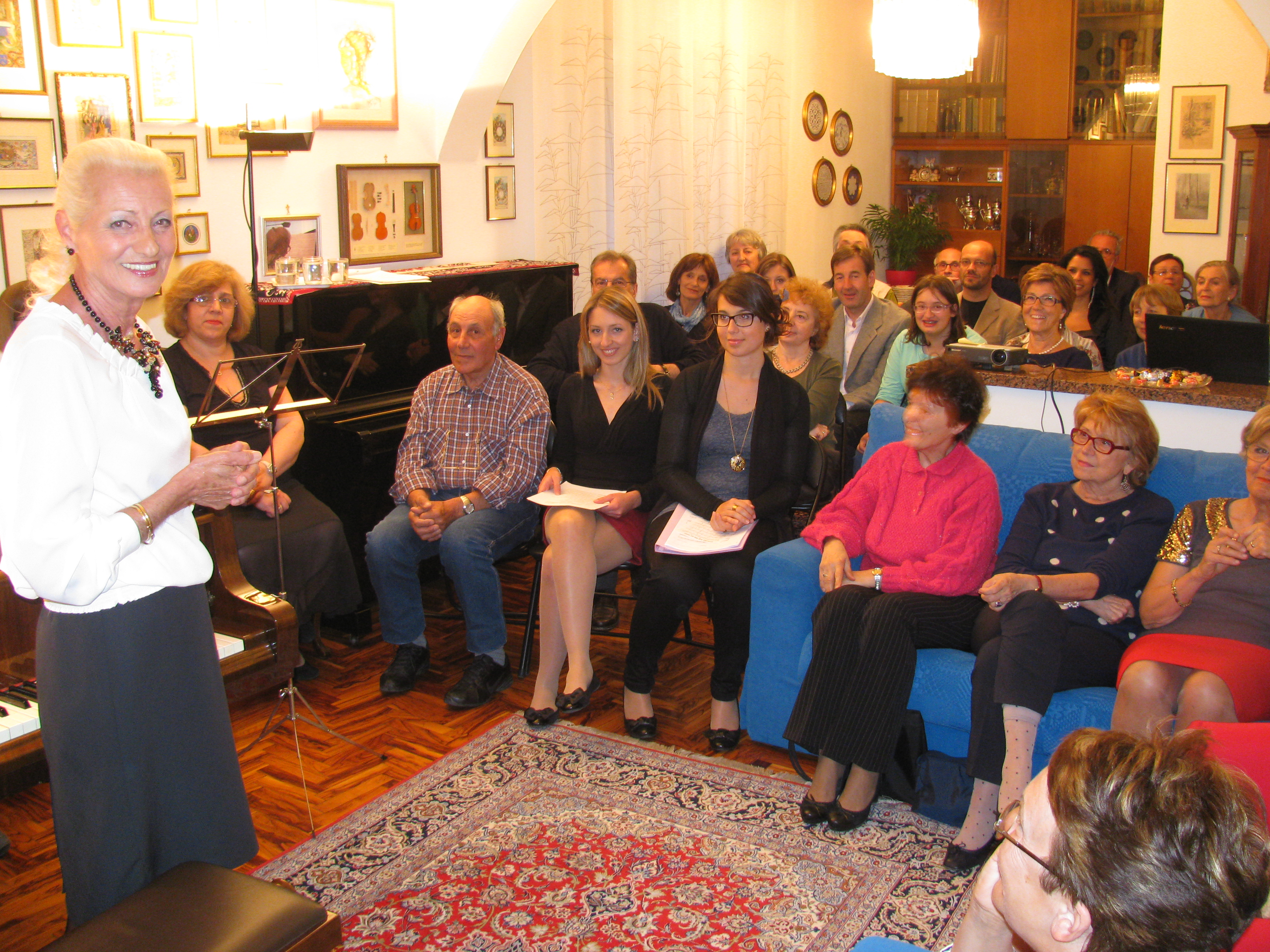 Quindi Cristina ci spiega i segreti del canto lirico ed introduce il primo “numero†della serata: i sei cantanti lirici che lei stessa segue (Cristina oltre che prof di piano è stata cantante lirica!): Cinzia Rosati, Michela Andreatta, Stefano Galetti, Giovanna Laudadio, Sergio Runcher, Letizia Grassi. Costoro cantano da tempo: chi da un mese, chi come Letizia è prossima al diploma o chi come Sergio, rinato ad una nuova giovinezza canora! Che età hanno? Be’ … coprono un ampio spettro! Il repertorio eseguito? Il programma di sala? Eccolo!