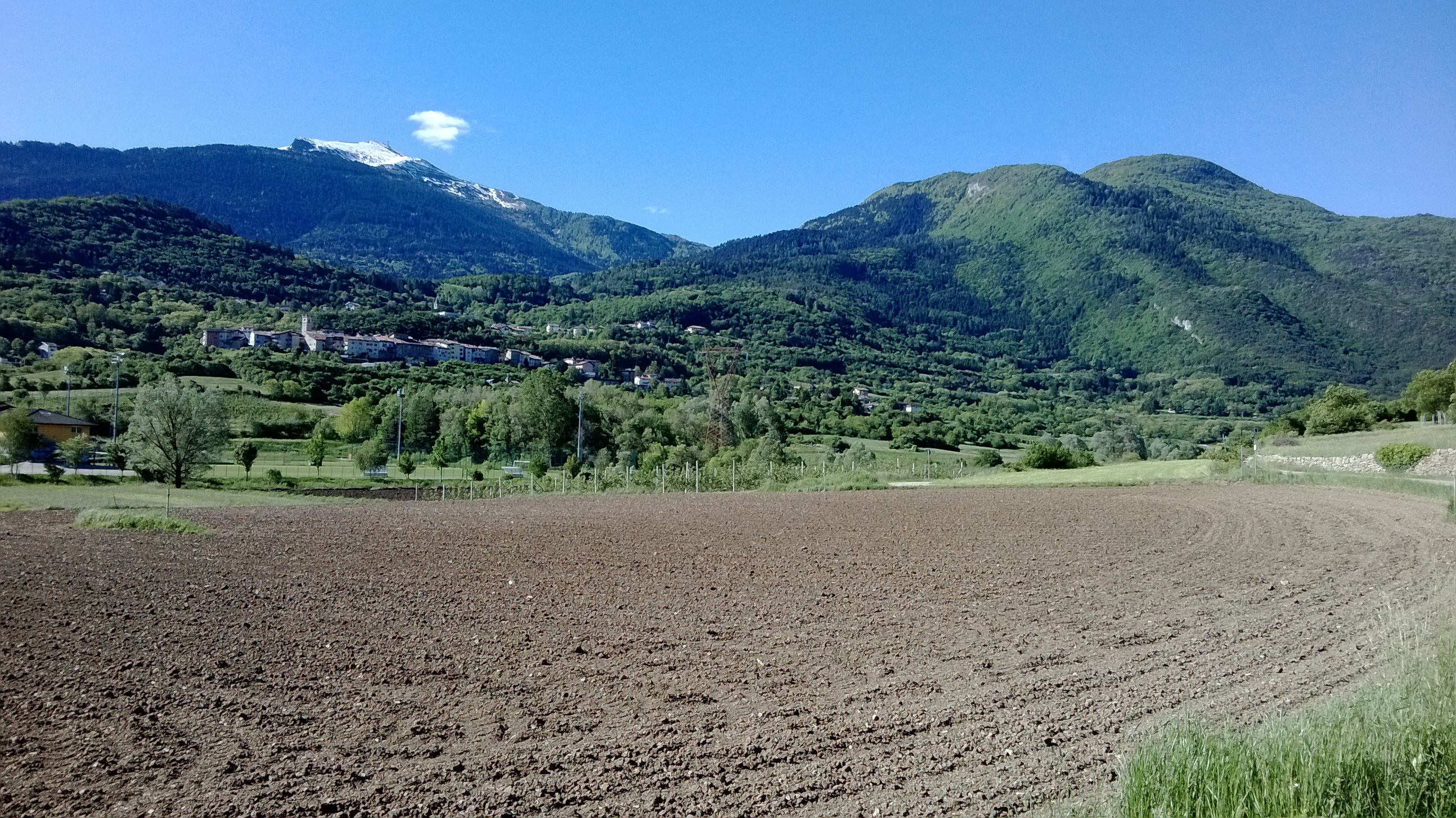 Si traversa la piana sottostante Vigolo Baselga (sullo sfondo, il Bondone, ancora innevato).