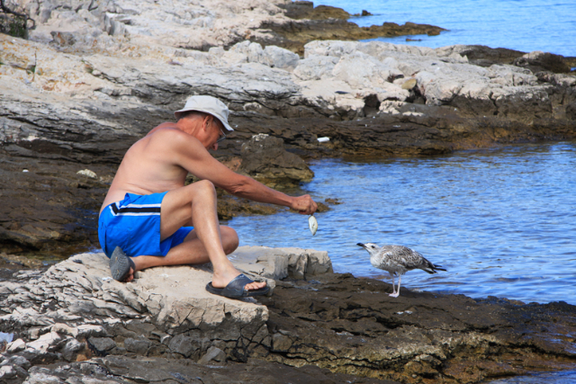 Ho deciso: la adotto, così come anni fa sono riuscito ad adottare un gabbiano. Non ci credete? Ero sulle isole Incoronate. Un giorno mi trovo davanti casa un gabbiano con un’ala piegata in modo innaturale. Non riusciva a volare e chi non vola non mangia. Gli ho posato qualche avanzo di pesce ad un paio di metri … E’ subito accorso! La cosa è durata parecchi giorni, con lui che mi aspettava ogni mattina appena fuori dalla porta di casa. L’ala andava sempre meglio, fino a quando una mattina non lo trovo più come al solito ull’uscio di casa . In compenso sento un frullar d’ali, e Lucky – così l’avevo battezzato – mi atterra quasi sui piedi. Era guarito! Per lui avevo i serbo alcuni pesciolini, “vittime†delle mie nasse, pesciolini che gli offro tenendoli in mano. Ebbene, non lo avreste mai creduto: da quel giorno Lucky è venuto a prendere il pesce direttamente dalla mia mano!