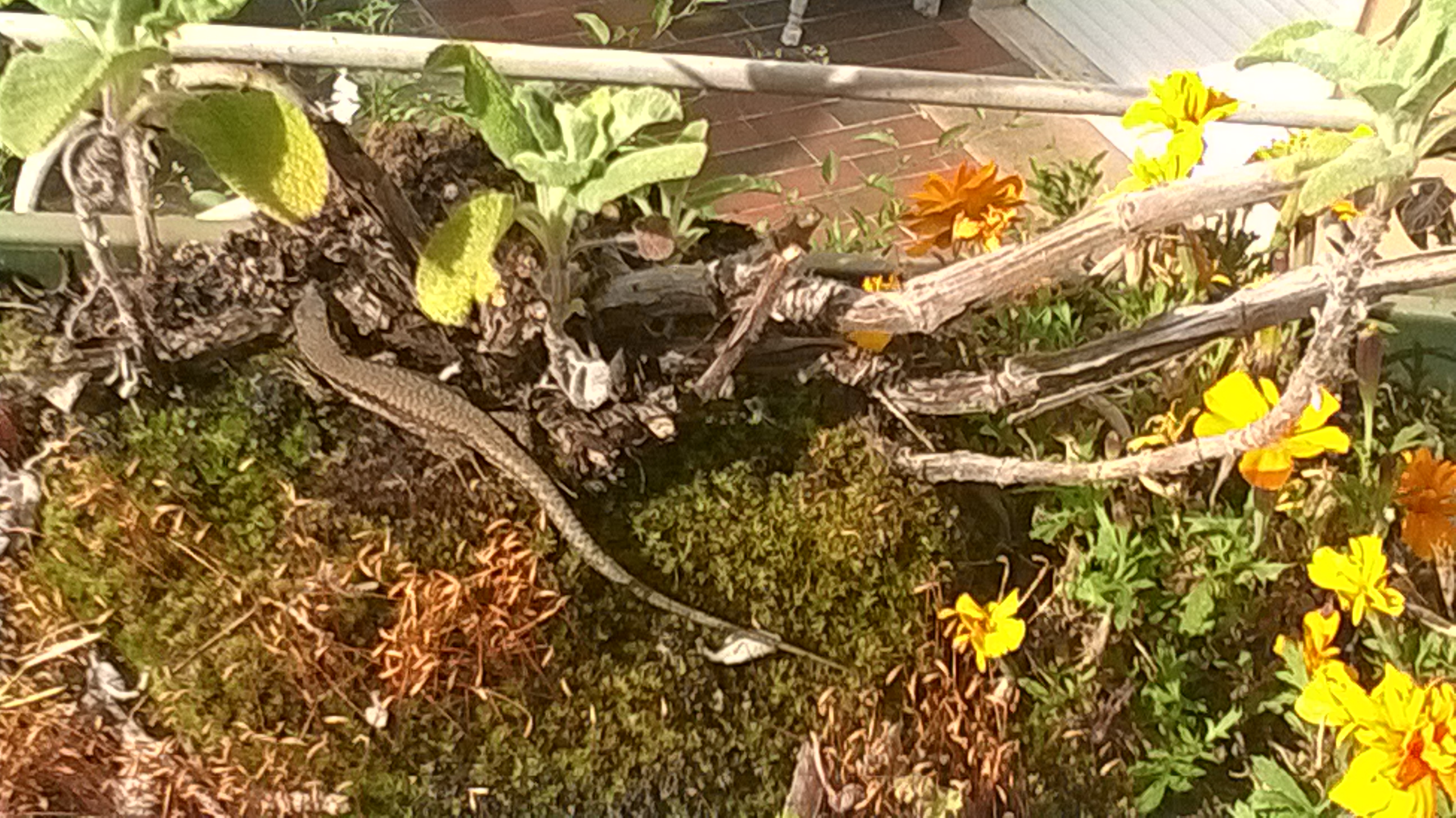 Comunque, ripulendo e smuovendo il terriccio ed in parte rinnovandolo, potando qua e là … erano già tre giorni che la vedevo, sempre dello stesso vaso, quello di una vecchia salvia impreziosito lateralmente da tageti spontanei. La prima volta ho pensato ad una visita occasionale. Mi sono detto: sarà di passaggio. Ma poi, rivendendola per tre giorni di fila … deve avere messo su casa fra le radici della salvia. Questa mattina mi sono avvicinato, piano piano e le ho scattato alcune foto, con il telefonino … e lei, la lucertolina, non si è mossa: è restata immobile, color della terra e dei rami. Non so se in posa per una vanità tutta femminile o nel tentativo di mimetizzarsi.