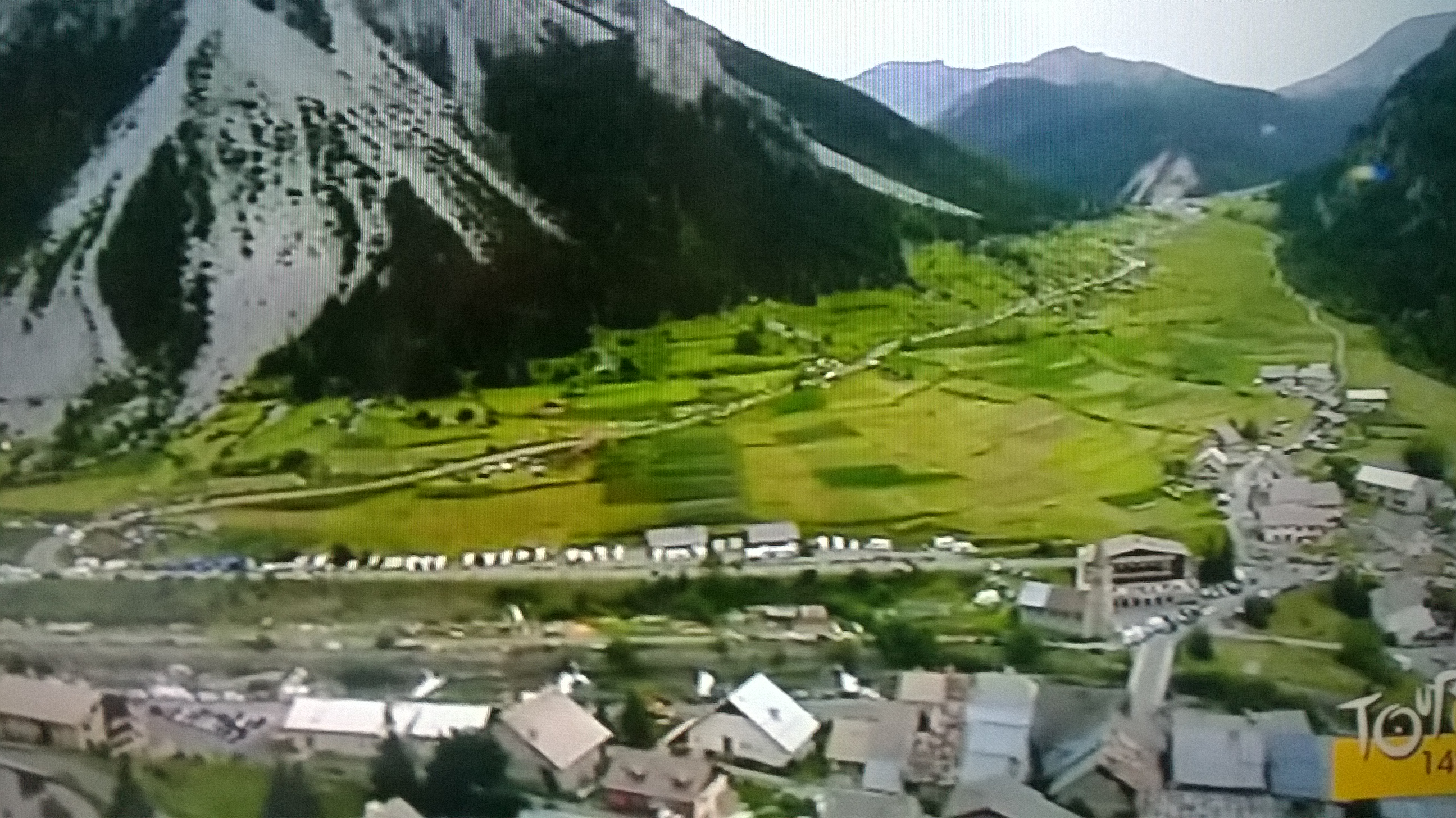 … ed alla vista di Cervieres (m. 1595, 173 abitanti), paese che si raggiunge dopo 9 km da Briancon con pendenze fino al 9%, paese nel quale la strada gira verso destra (nella foto, provenendo da in basso a destra, curva verso quella risalita da sinistra verso destra sulla conoide verde d’erba), verso l’Izoard …. Cervieres che in inverno avevo raggiunto anche in sci (fuori pista splendido di oltre 12 km!) dal Colletto Verde (2560), (a sua volta raggiunto in funivia dal passo del Monginevro), e che in estate avevo raggiunto anche in mountain bike, dopo essere salito (a pedali!) da Cesana (1354)  al Colletto Verde (2560), per poi scendere a Cervieres e Briancon bassa (1100) e raggiungere la famiglia che era andata in auto  a fare il bagno alla Roche-de-Rame, un grazioso laghetto lungo la strada fra Briancon e Guillestre.