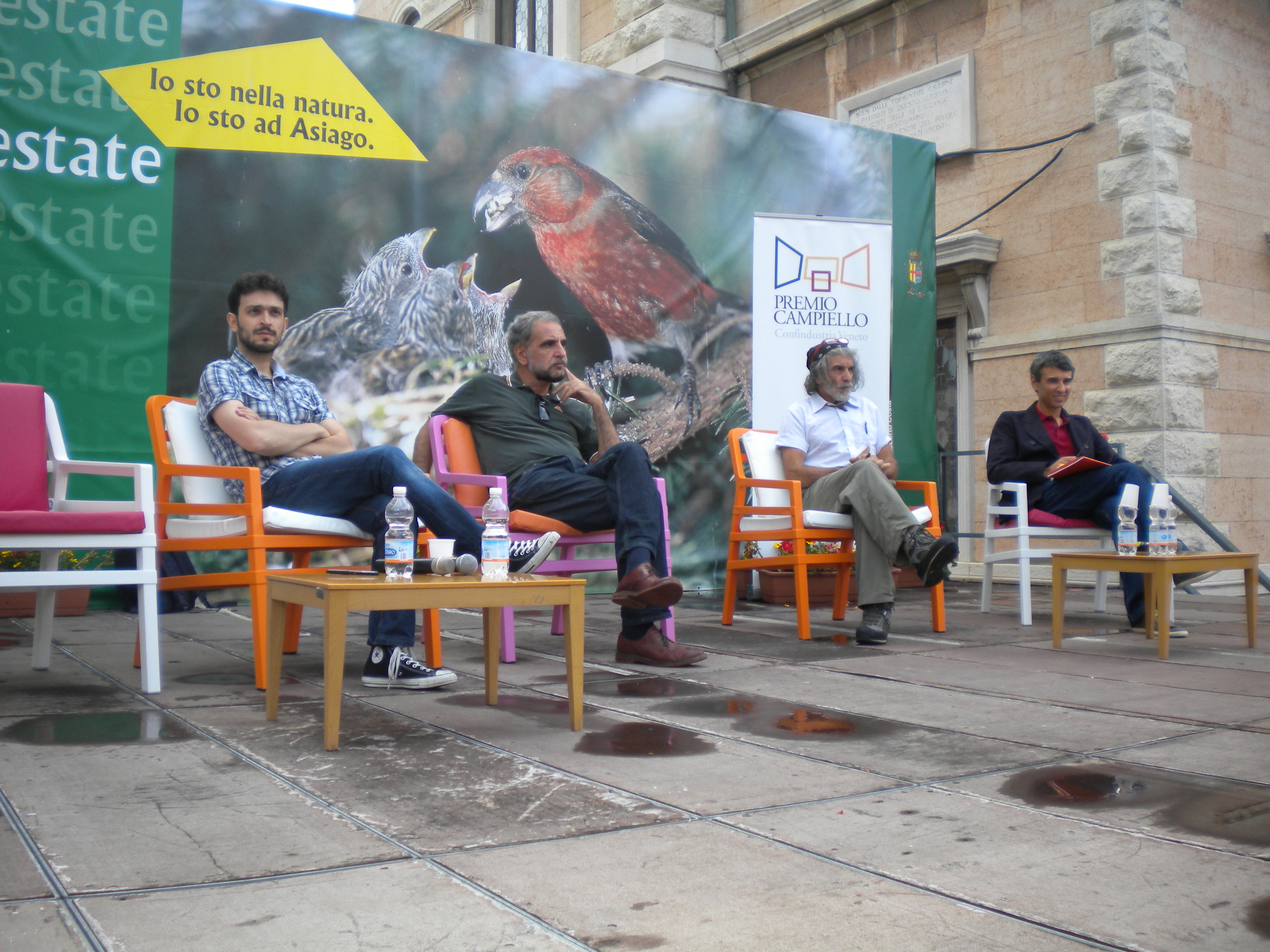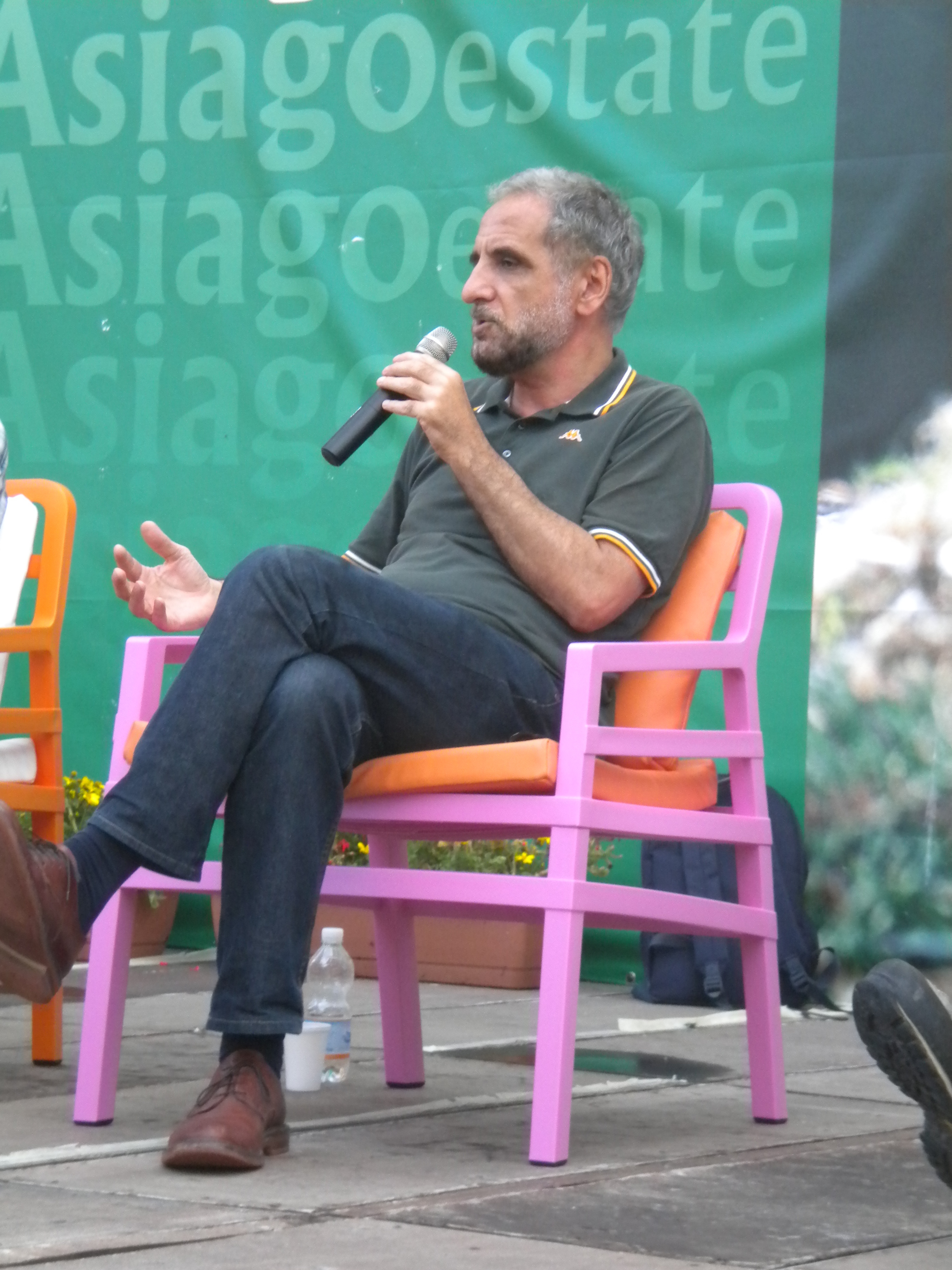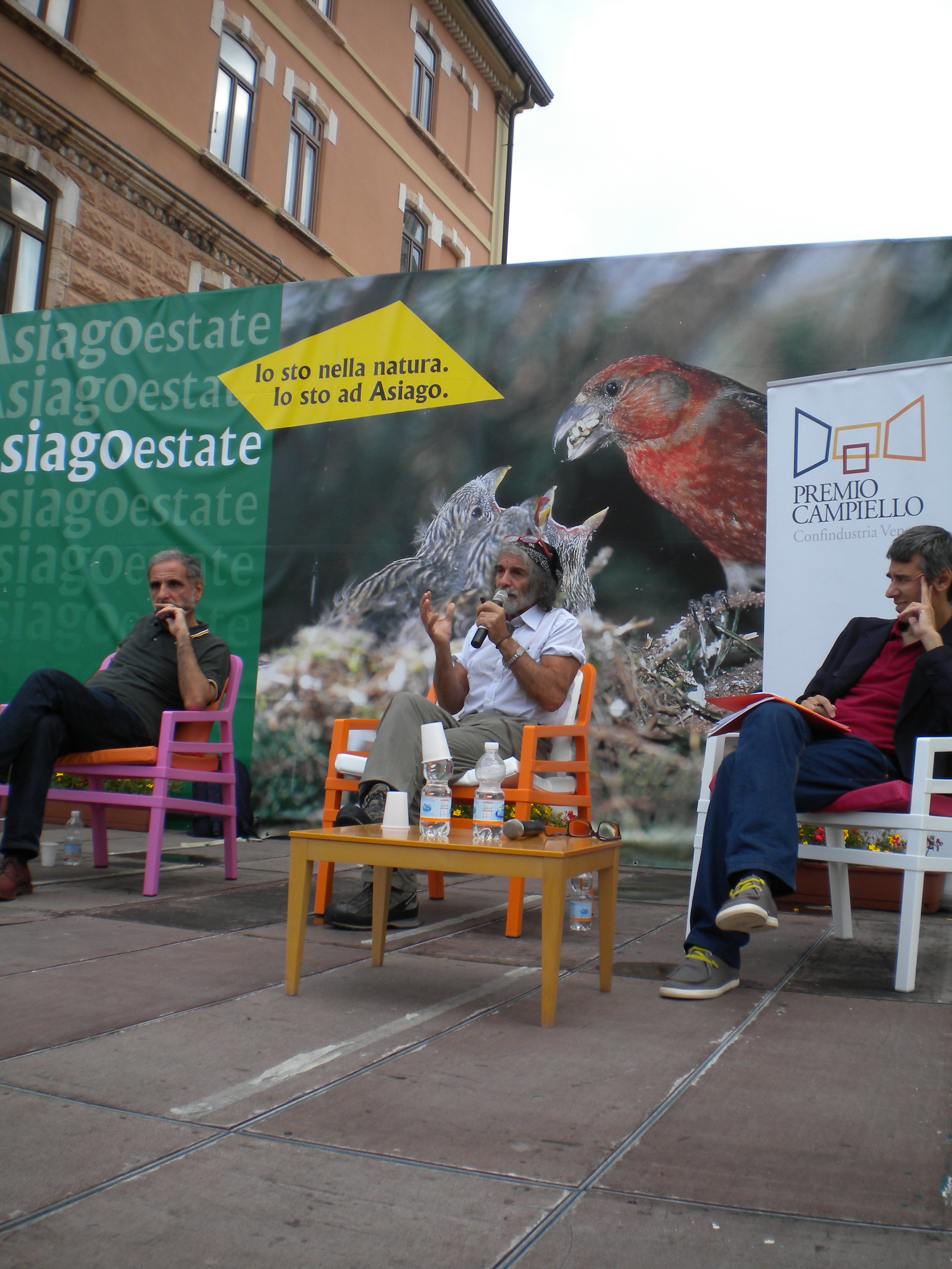 Due tornate di interviste. Io ho assistito solo alla 1,2 cioè alla prima ed ad un pezzettino della seconda, me ne scuso con tutti, intervistatore, intervistati, pubblico … ma dovevo rientrare a Trento e poi io, vestito estivo, la sera a 1000 metri fa freschino, la mia bronchitina… poi ne avrebbero fatte le spese le mie biciclette che domani devo farmi un centinaio di km per la Val Venosta, pioggia permettendo … Pioggia che invece in questa estate-non-estate ad Asiago si è fatta da parte quel tanto da consentire la manifestazione all’aperto. Grazie, pioggia!