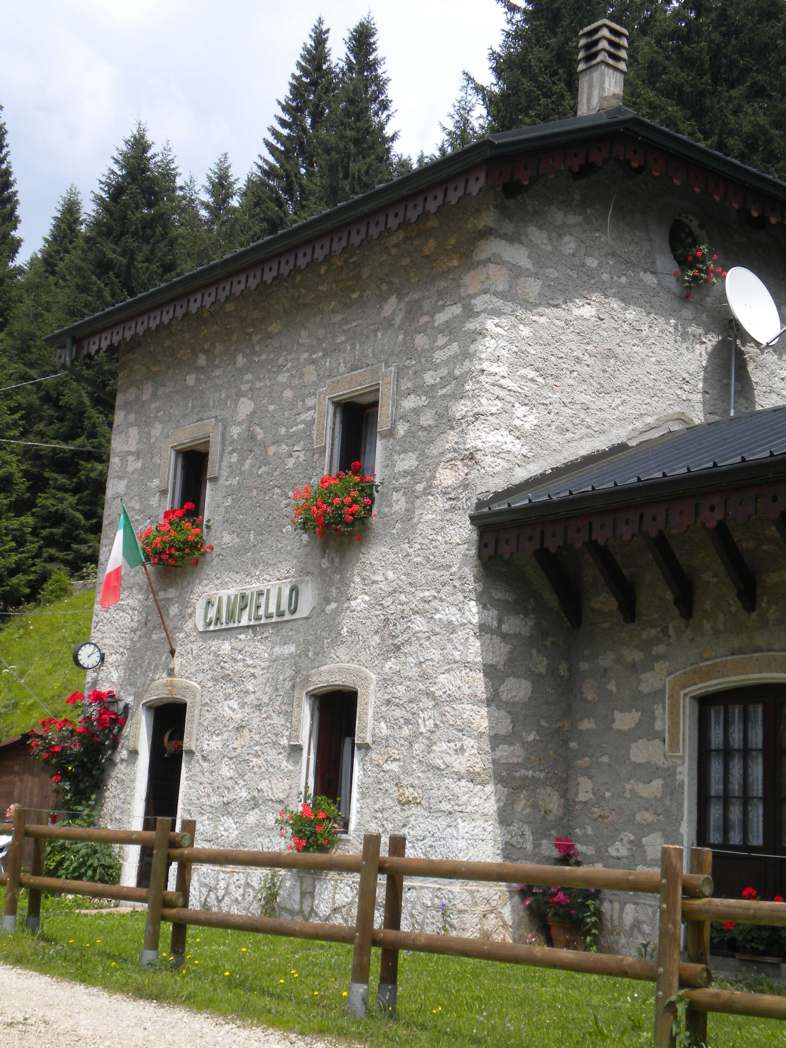 La mattina lungo la statale che scorre parallela alla vecchia ferrovia di Montagna Rocchette-Asiago. C’ero già stato, anche qui in bicicletta con gli amici della FIAB Trento. La ferrovia. In internet esiste molto sull’argomento (navigate e leggete, ne vale la pena!). Io qui vorrei ringraziare l’Associazione Sorico – Culturale  Fronte Sud – Altopiano 7 Comuni per la pubblicazione dell’interessante opuscoletto che ho trovato sui tavoli della Trattoria Ai Granatieri in località Campiello, una delle fermate della ferrovia, appunto.