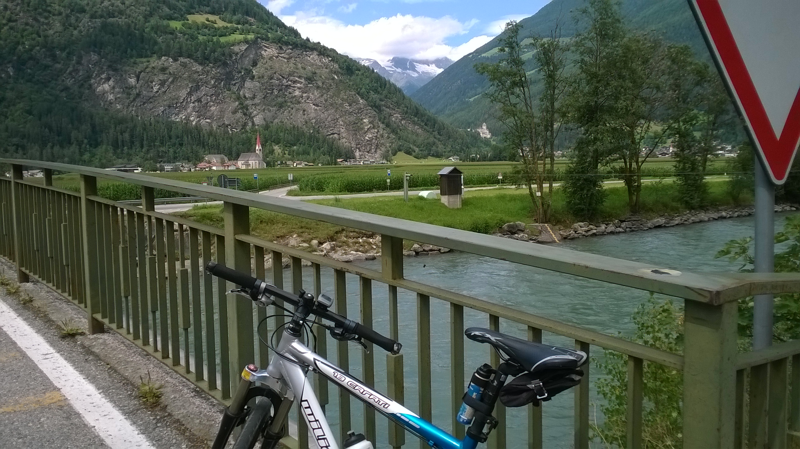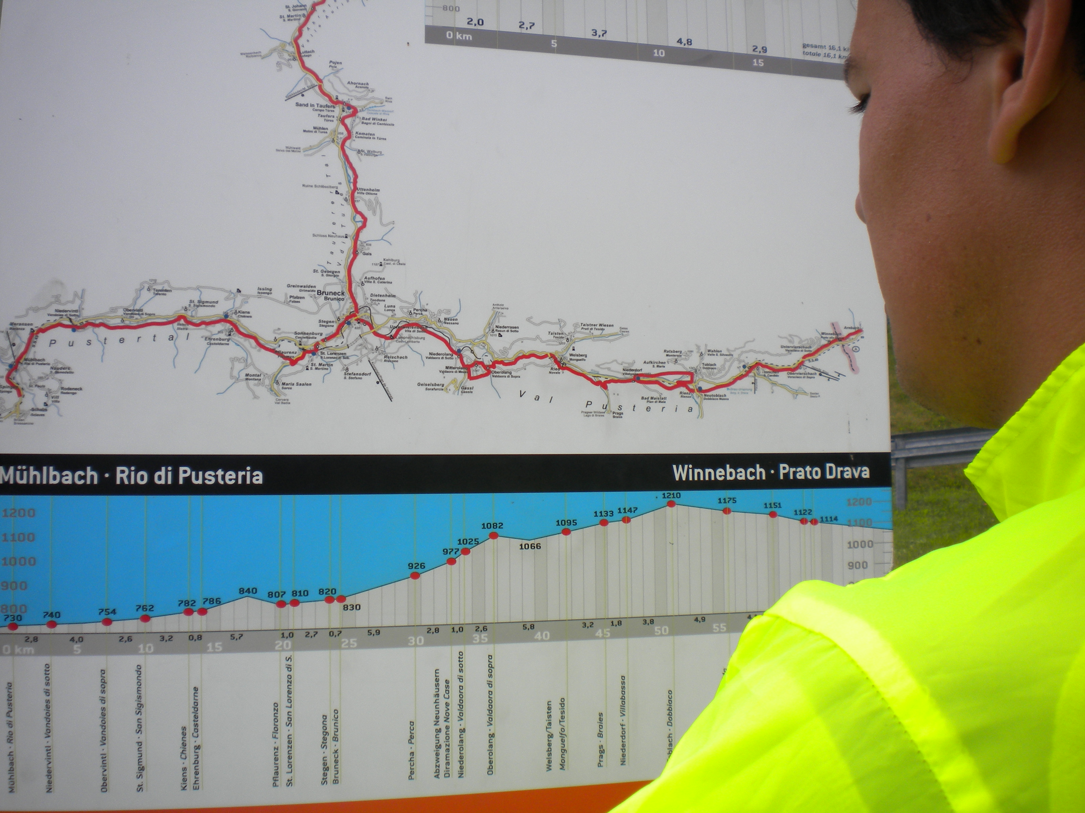 La tratta Brunico – Rio Pusteria  viene indicata nelle tabelle altimetriche diligentemente e frequentemente collocate lungo il percorso come interamente in discesa. Invece presenta dei saliscendi con rampe corte ma impegnative che hanno messo in seria difficoltà una famigliola di francesi con biciclette stracariche tipo mi porto tutto con me. In totale, km 87,00. Bici usate, mtb.
