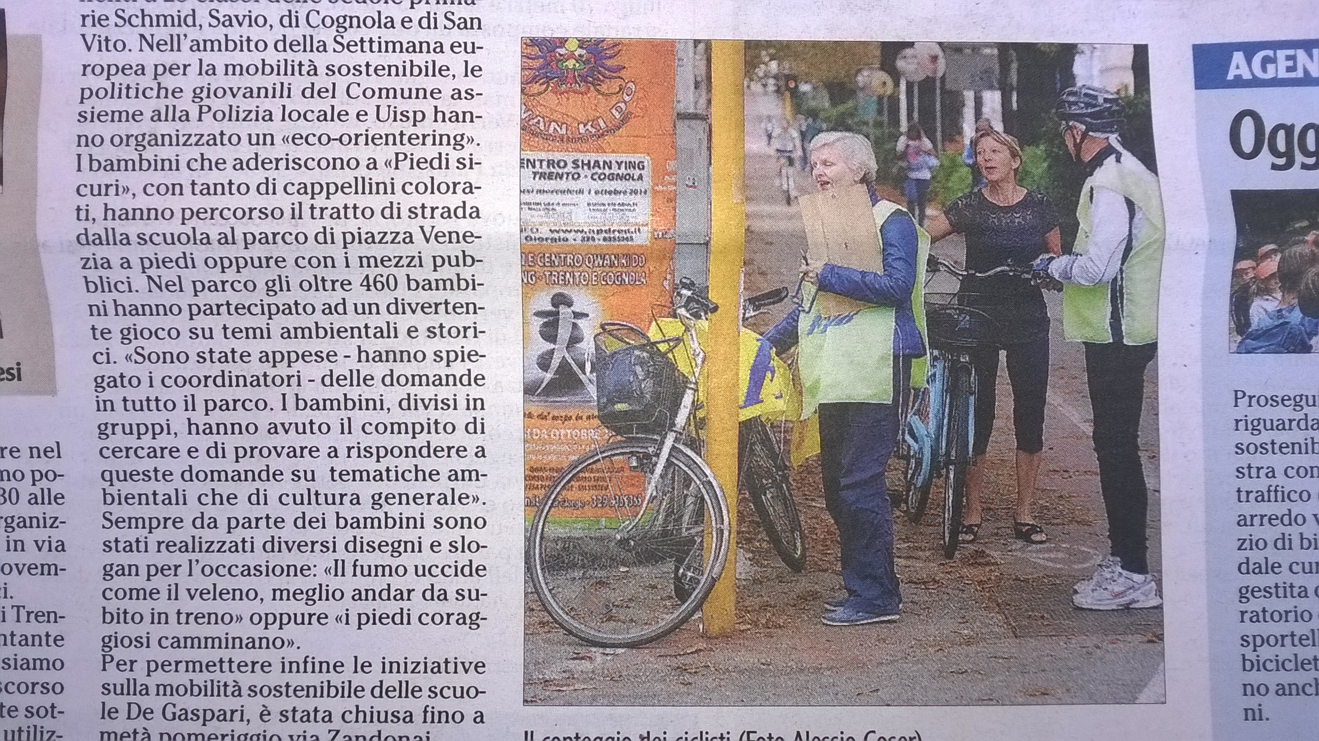 Ieri a conteggiare le persone che entrano in città per recarsi al lavoro utilizzando la bici (nel 2012 Trento ha vinto questo “campionato italianoâ€!). Oggi tutti in Piazza della Mostra, a Trento, con tanto di gazebo, depliant etc.. insieme a tante altre iniziative ciclistiche.