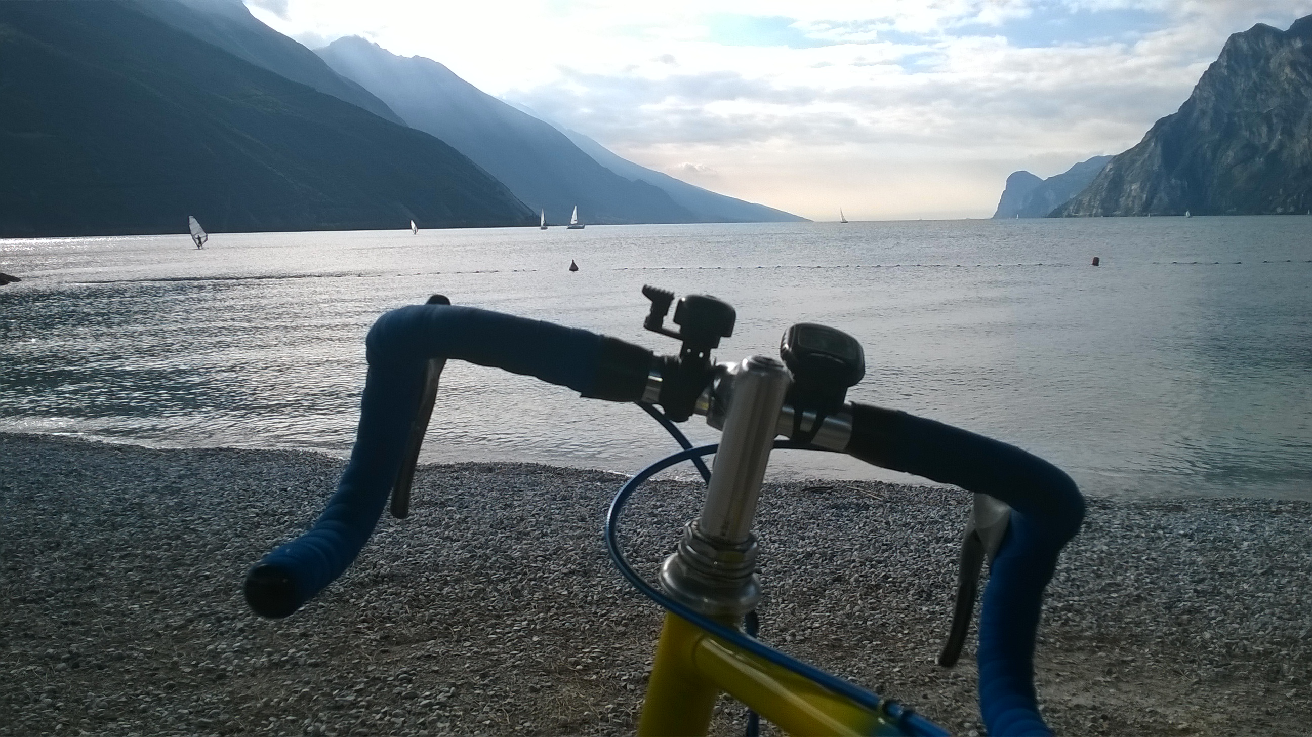 Un viaggio significativo, dunque, che merita un articoletto sul mio blog. Da Trento al Bicigrill di Mori, 37 km, una volata, volata per me, vecchietto di 70 anni, alla media di 21 kmh. Poi sono cominciate le … fotografie. Il Lago di Loppio e soprattutto Sua Maestà il Lago di Garda. Non avevo fretta ed allora mi sono detto: “Why not� La faccio breve e ve ne allego solo una: la mia Bicicletta che guarda il lago, estasiata. Come? Ho sbagliato … ho scritto “Bicicletta†con la “B†maiuscola? No, ragazzi … non è un errore di battitura …. e come farei, dopo che mi sta accompagnando da oltre trent’anni …. Sempre Lei, sempre la stessa, la quale sicuramente mi avrà perdonato se le ho cambiato i rapporti al pedale (da 52-39 a 50-34); i pedali (dalle cinghiette di cuoio agli attacchi Look) e se  le ho incassato i cavetti dei freni sul manubrio. A parte questi ritocchi, è sempre lei, 12 kg di affetto allo stato puro, con i quali a suo tempo e con i rapporti “vecchi†ho scalato Manghen, Monginevro, Izoard, Lautaret, Galibier, Telegraf, Moncenisio, Sestriere, Bondone, Rombo, etc. etc… Vecchio pedale, quanto tempo è passato …