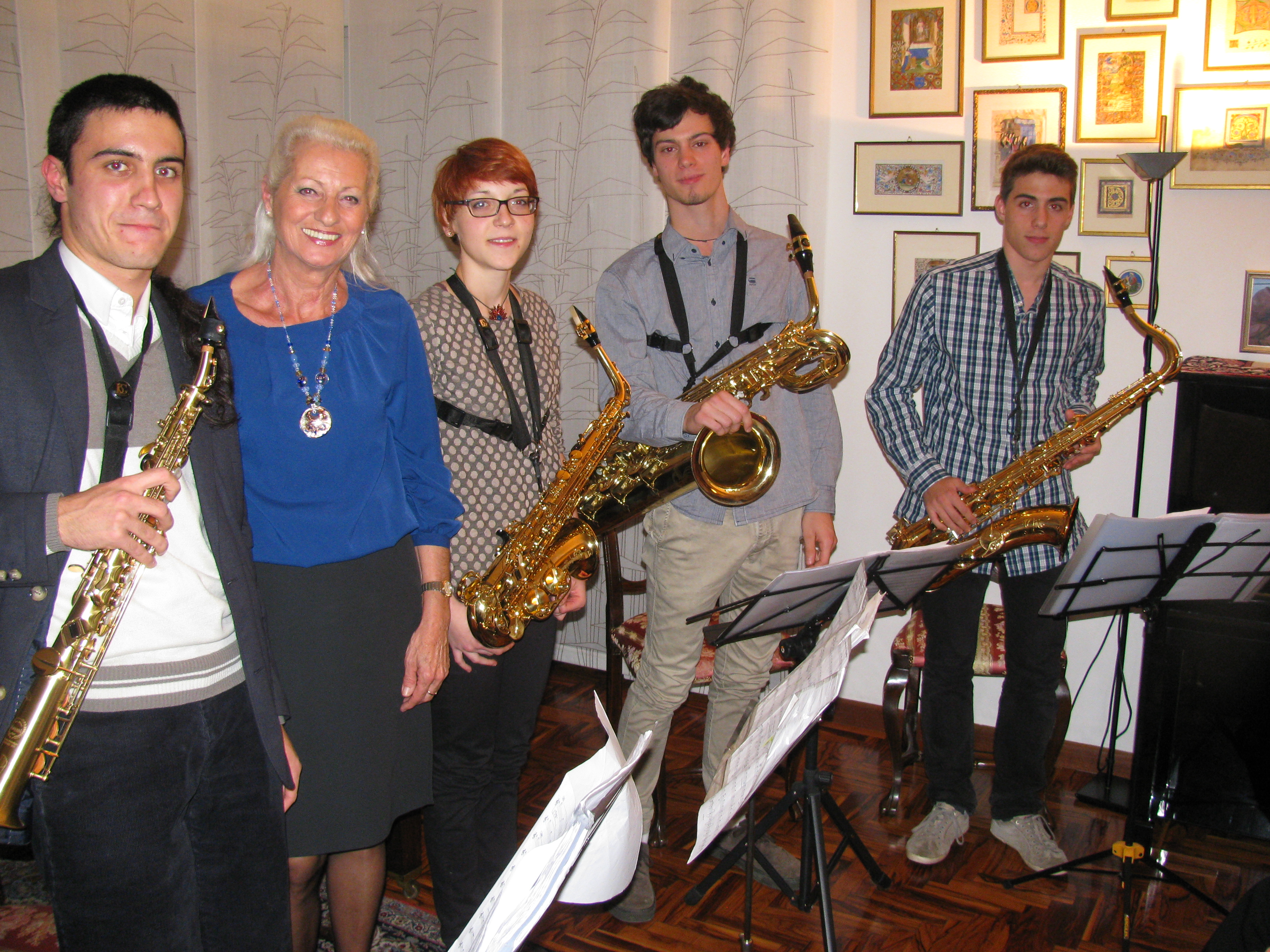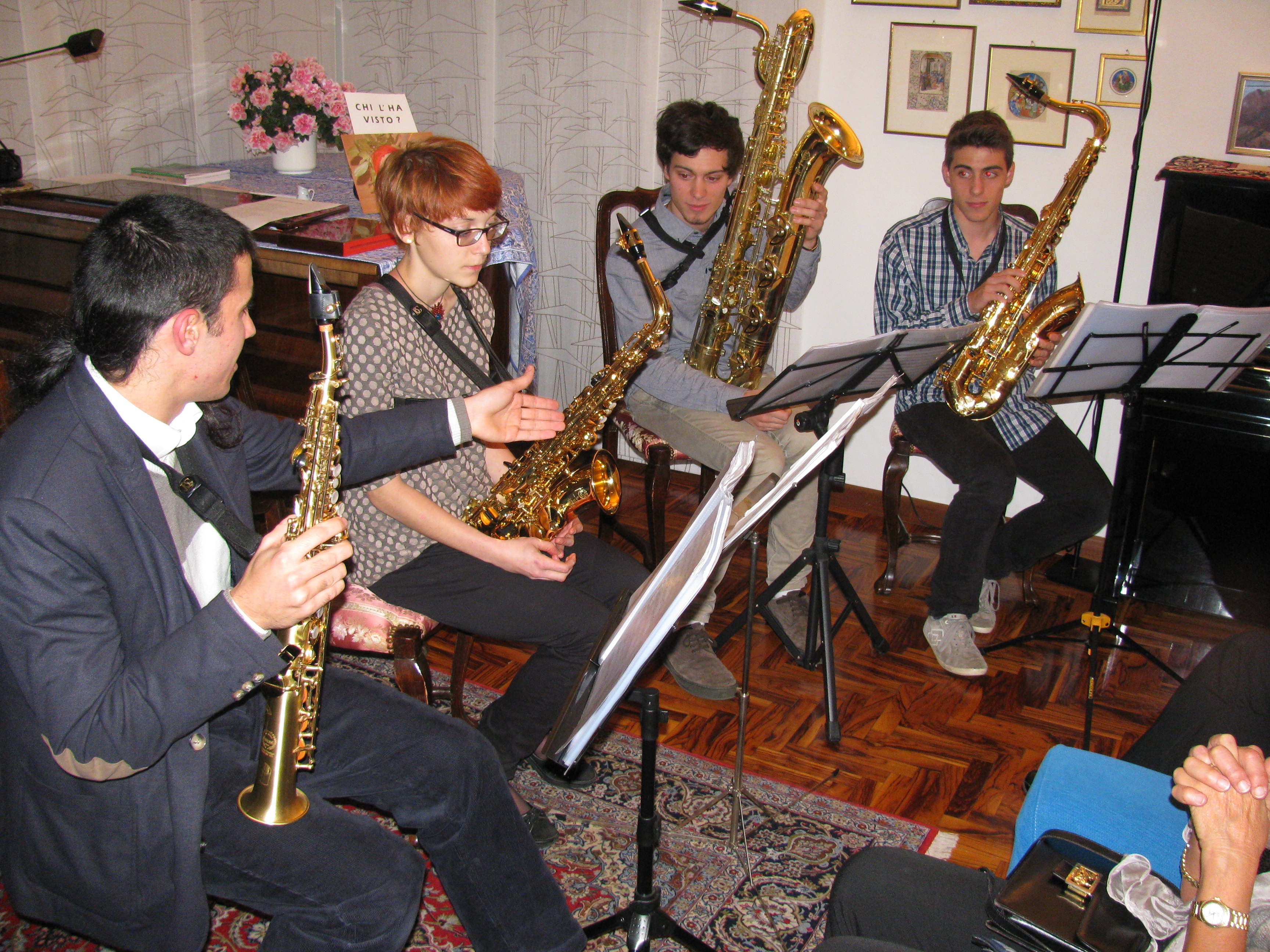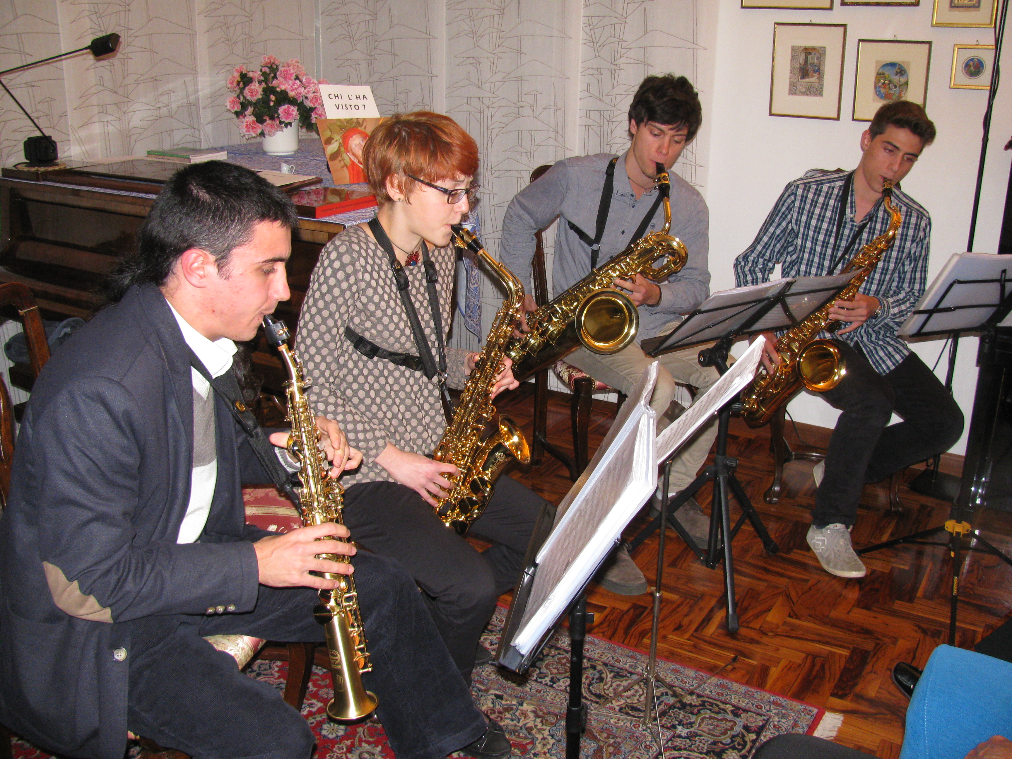 Detto questo … ieri sera – come al solito nella nostra “sedeâ€, ovvero in casa della Presidente Cristina, seratona! Infatti ha riempito la prima parte della serata il quartetto di sassofonisti Smart Sax Quartet composto dai giovani Mattia Grott, Martina D’Amico, Filippo Corbolini, Mattia Giacomozzi i quali (ormai “nominati†Accademici delle Muse, con diritto-dovere di partecipare alle nostre serate!) hanno eseguito il seguente programma.