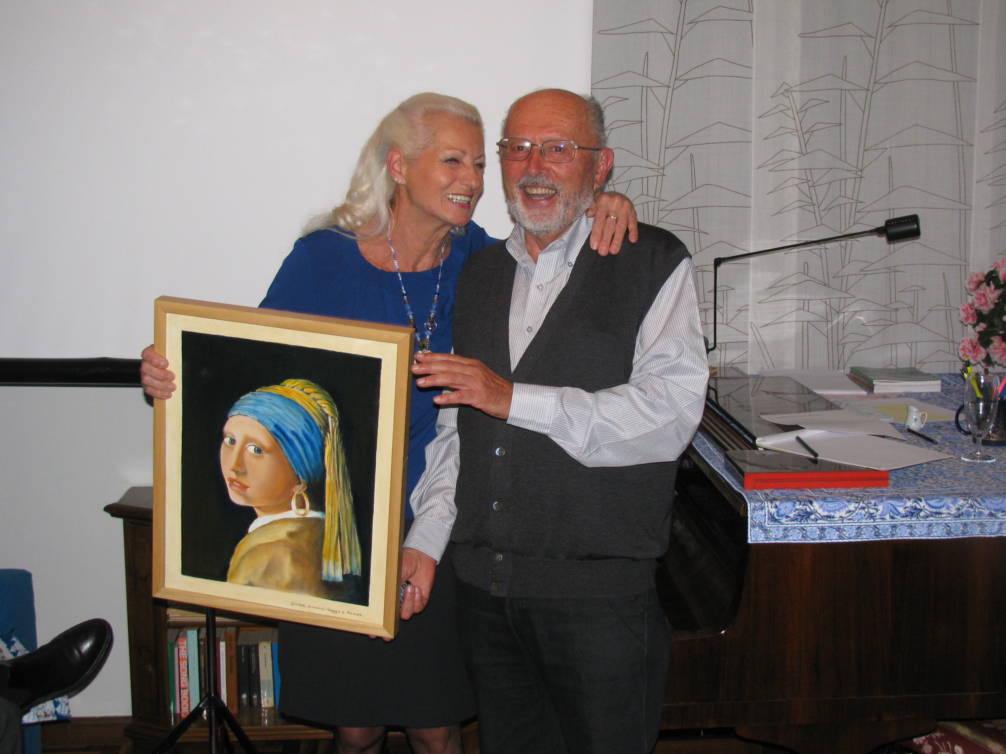 Dopo questo appetitoso intermezzo, è stata la volta di Giovanni Soncini con i suoi “Falsi d’autoreâ€. Egli, ingegnere in pensione, dopo 40 anni di semiconduttori, andando in pensione ha voluto dedicarsi a tutt’altro genere di impegni: la bicicletta (e qui è la mia vittima prediletta, l’agnello sacrificale, nel senso che i 50 km alla volta ormai non glieli toglie più nessuno! Bravo Giovanni, in sella alla “ciclo†più bella del mondo!) e soprattutto alla pittura. Ma perchè “falsi d’autoreâ€? Perché egli prende di mira autentici capolavori e li rielabora, semi copiandoli, aggiungendo particolari inediti e comunque reinterpretandoli.
