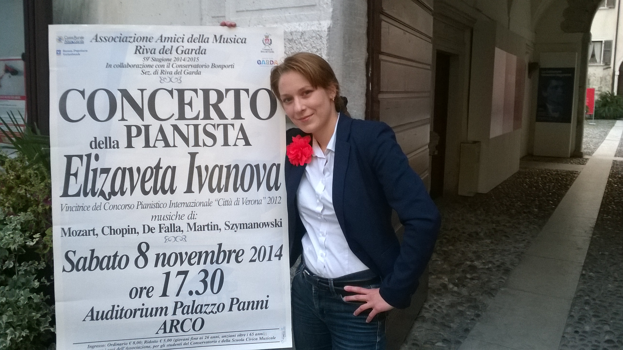 Arco (Tn). Palazzo Panni. Presto ospiterà una mostra su Segantini. Ieri, grazie alla collaborazione del Comune della città e della bibliotecaria signora Dora Giovanazzi, ha ospitato il concerto pianistico di Elizaveta Ivanova, Liza per gli amici, organizzato dall’ Associazione Amici della Musica di Riva del Garda, presieduta dal Professor Franco Ballardini. Liza, una bella ragazza di 27 anni, nata a Mosca, ha già un curriculum vitae di tutto rispetto e dal 2012 vive ed opera ad Hamburg. Già nel luglio 2013 era stata ospite dell’Associazione citata per un concerto in Riva del Garda (v. post n. 890 del 10 luglio 2013) quando ancora era con noi il compianto Presidente Ruggero Polito), in quanto l’Associazione ha inteso invitare i vincitori del Concorso Pianistico Internazionale di Verona. E Liza lo ha vinto due anni fa.