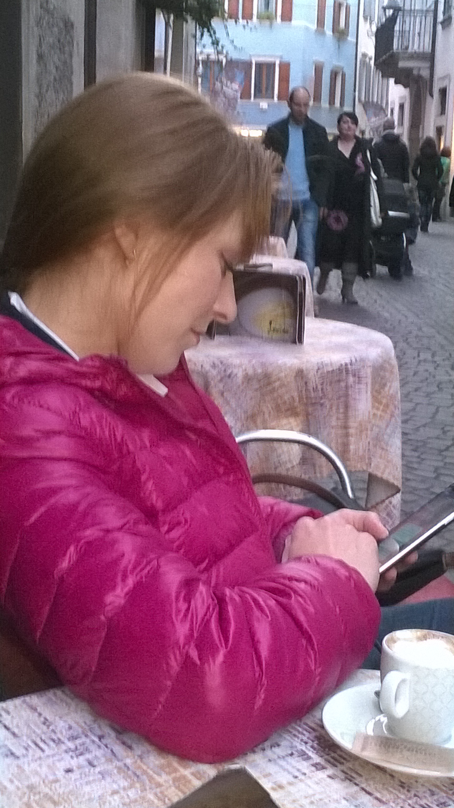 Manca un’ora al concerto. Siamo seduti in un caffè lungo la strada del centro storico di Arco. Scatto una istantanea mentre Liza sta telefonando. Gliela mostro: “Paparazzoâ€, mi dice sorridendo! Poi mi chiede di scusarla. Preferisce passeggiare da sola, per concentrarsi meglio, per ripassare i milioni di note e sfumature che dovrà governale con le sue mani. Milioni di variabili gestite dal cervello più potente del mondo: il cervello umano. Milioni, dicevo … chi conosce un po’ di matematica, provi un po’ a calcole quanto fa “n su k fattoriale†ovvero la combinazione di n variabili su di un numero molto alto di possibili combinazioni! Perdonerete questa osservazione che può apparire un prosaica, ma occorre riflettere anche su questo aspetto.