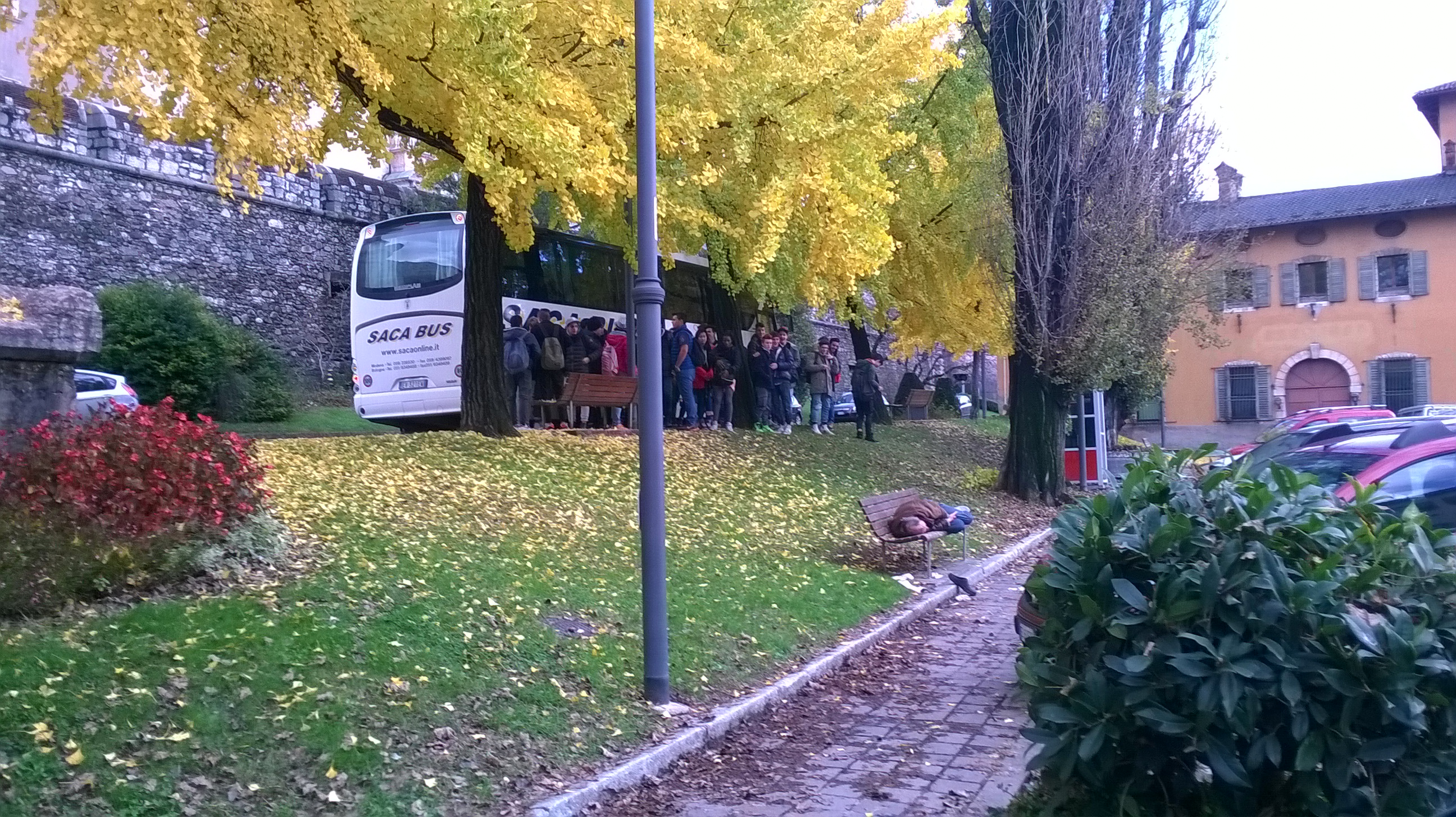 Ore 14,35: scorgo una persona addormentata su di una panchina proprio all’altezza dell’area di sosta dei bus turistici. Fa freddo. Lui indossa una giacchetta leggera e per ripararsi dorme in posizione “fetaleâ€. ai piedi una sola scarpa. L’altra è a terra. Arriva un esponente della Polizia Locale. Io mi aspetto che lo svegli, lo soccorra. Niente di tutto questo. Si avvicina, lo guarda, se ne va. Io lo fotografo di spalle … hai visto mai che mi arresti per … chessò? “Foto abusiva di Pubblico Ufficialeâ€â€¦ è meglio essere prudenti … noi blogger …