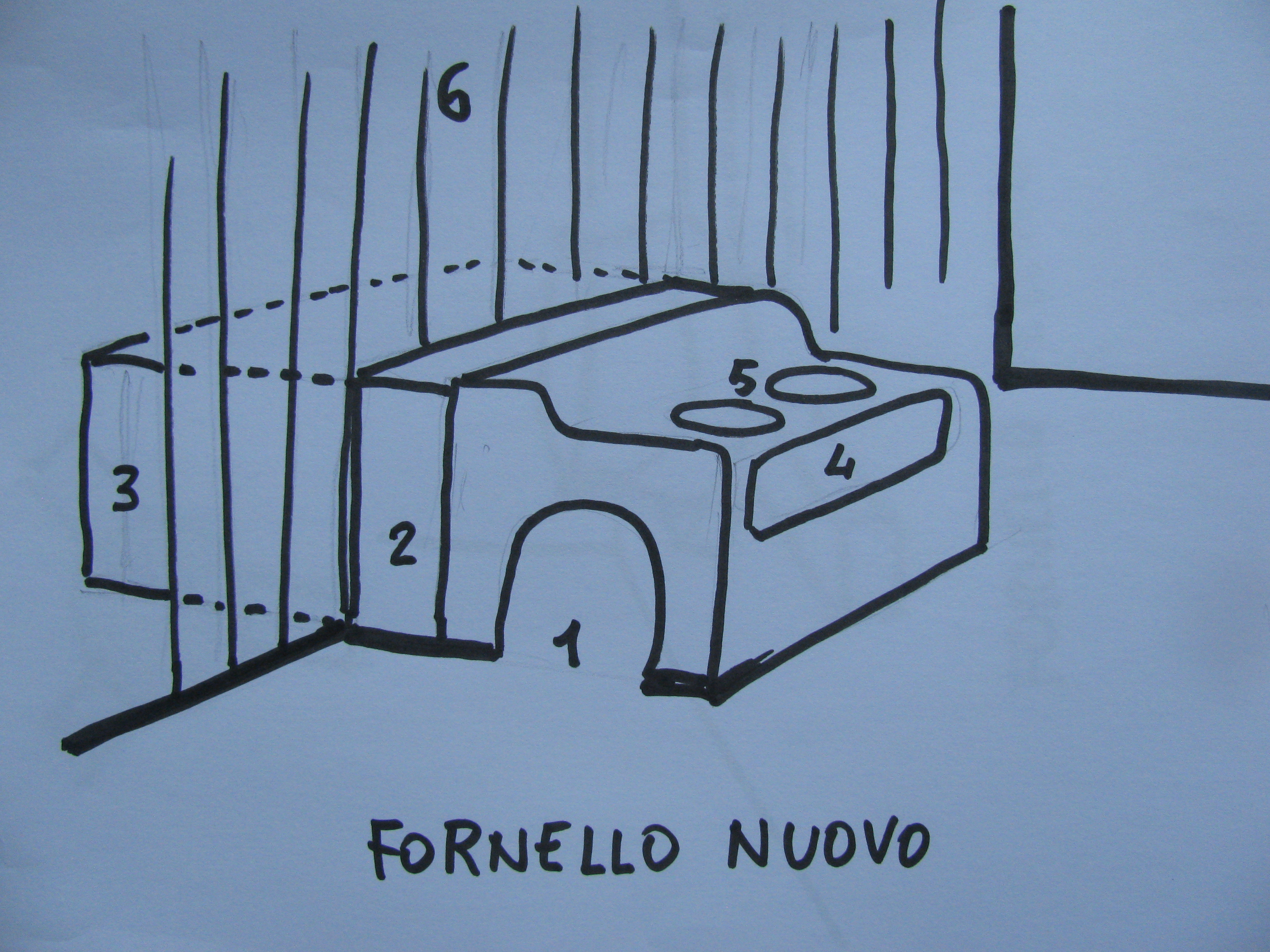 1) Incubatrice – 2) Recinto interno – 3) Recinto esterno – 4) Alimentazione combustibile – 5) Fornelli – 6) Parete della capanna