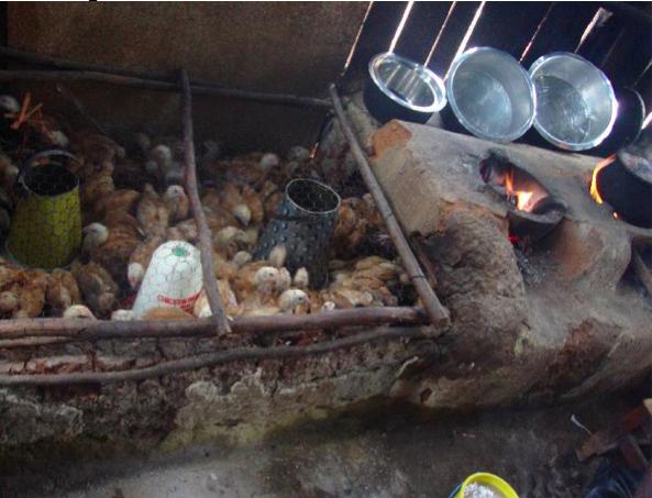 - Ma vi è un ulteriore vantaggio: infatti queste stufe, nelle quali l’alimentazione della legna avviene fa una fessura orizzontale posizionata nella parte superiore/anteriore della piccola struttura, presentano, a livello pavimento, la cavità tipica delle stufe a olle costruite nelle nostre montagne. Qui sotto vengono deposte le uova da cova al posto della legna da seccare o delle scarpe da asciugare: le uova si schiudono ed i piccoli pulcini possono trovare del mangime in un ambiente estremamente pulito, caldo, secco e buio, senza l’oltraggio di un lampada accecante come nelle nostre incubatrici industriali. Ad onor del vero a mettere per la prima volta le uova sotto la stufa non è stato un centro studi ma – casualmente e per errore – un bambino keniota!