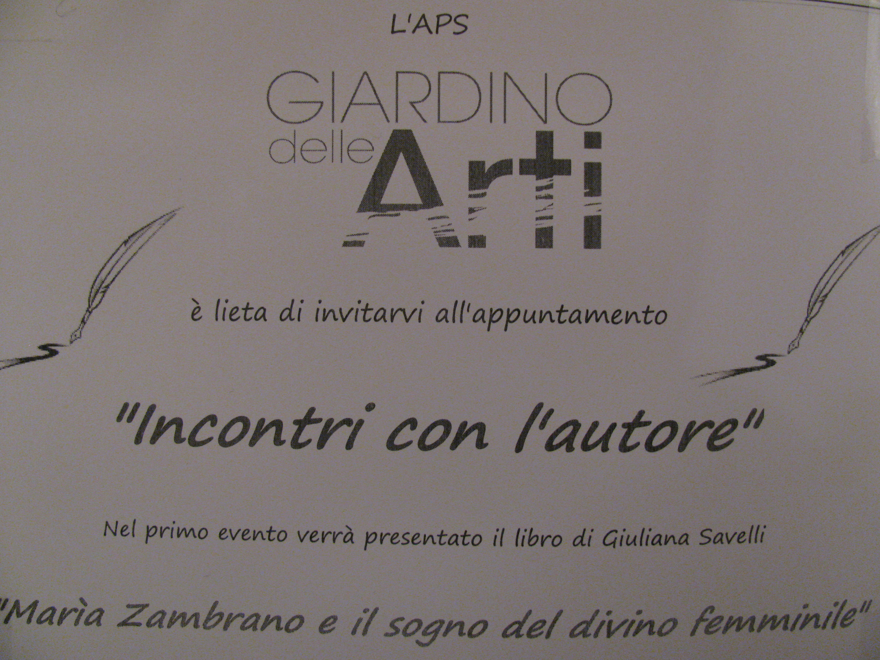 A LAS CINCO DE LA TARDE: Associazione Culturale Il Giardino delle Arti – Per iscriversi contattate la mia collega blogger Mirna Moretti – Ci siamo ritrovati in Via Ottaviano Rovereti, 2 a Trento. Presentazione del libro di Giuliana Savelli “Maria Zambrano e il sogno del divino femminile”, Iacobellieditore, con contributi – fra gli altri – di Anna Turri Vitaliani e Giovanni Marconi, entrambi presenti alla presentazione insieme all’Autrice.