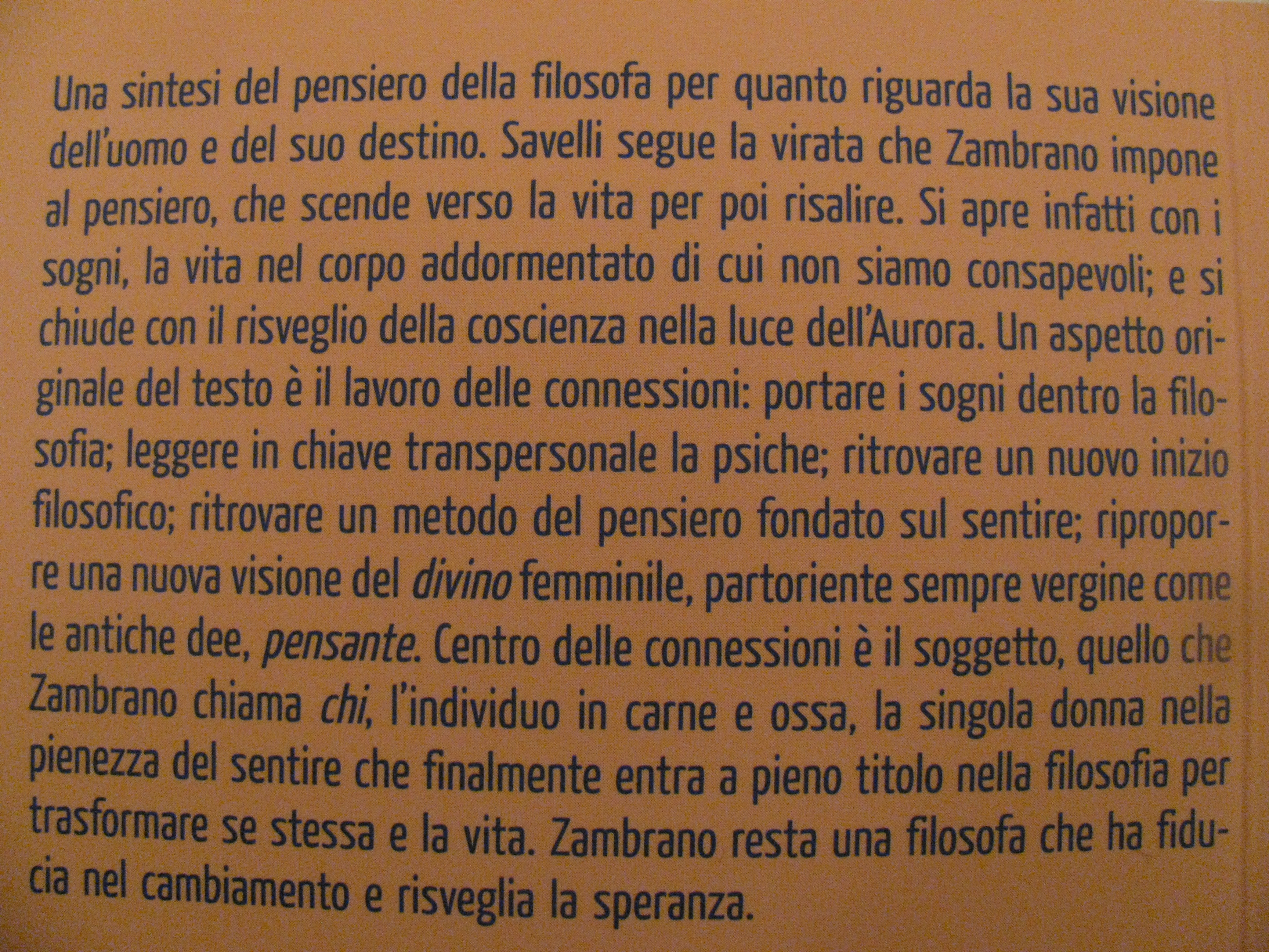 Premetto: non sono nè un filosofo nè uno studioso della storia della filosofia, quindi mi scuseranno gli Autori (e i lettori) per quanto mi sto azzardando a scrivere sull’argomento. Infatti ho detto all’Autrice che avrei scritto dell’evento assai più che del libro. Innanzi tutto, ciò che ho inteso è che si parte dal “femminile” ma si tratta dell’universa umanità . La spiritualità ? E’ soprattutto creazione, e più creazione della vita non esiste (ecco il femminile, n.d.r.). Comunque, creatività “anche” come trasformazione di se stessi, alla quale i mistici arrivano attraverso un atto di Amore. Altri, diversamente. Infatti per la Zambrano il sogno è la struttura di fondo da cui “ha preso le mosse l’umanità “, sogno come arte e comunicazione delle società pre-letterarie. In tal senso aiuta a comprendere il concetto l’intervento di Giovanni Marconi, che riferisce di convegni internazionali multidisciplinari i quali hanno rilevato che i milioni di petroliti (incisioni e disegni) preistorici (v. Val Camonica in particolare) sparsi per tutto il mondo, per il 96% rappresentano istanze dell’anima, di persone che “parlano a se stesse” e solo per un 4% descrivono come si caccia, come si costruisce un riparo, come si attraversa un fiume.