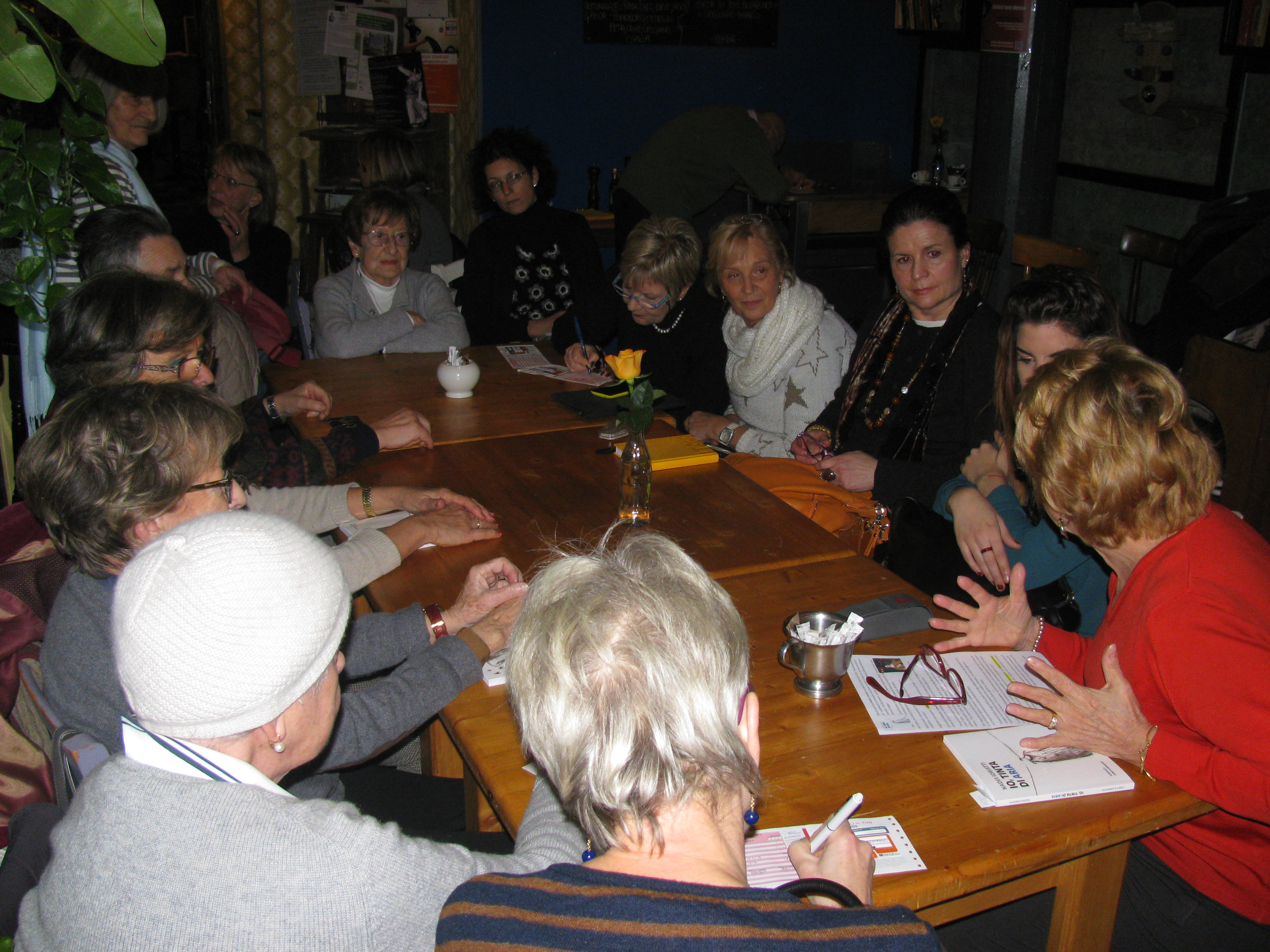 Mirna Moretti, in rosso, di spalle, gestisce la presentazione-discussione di “Io tinta di aria” a Librinciontri-Cafè de la Paix, gennaio 2015