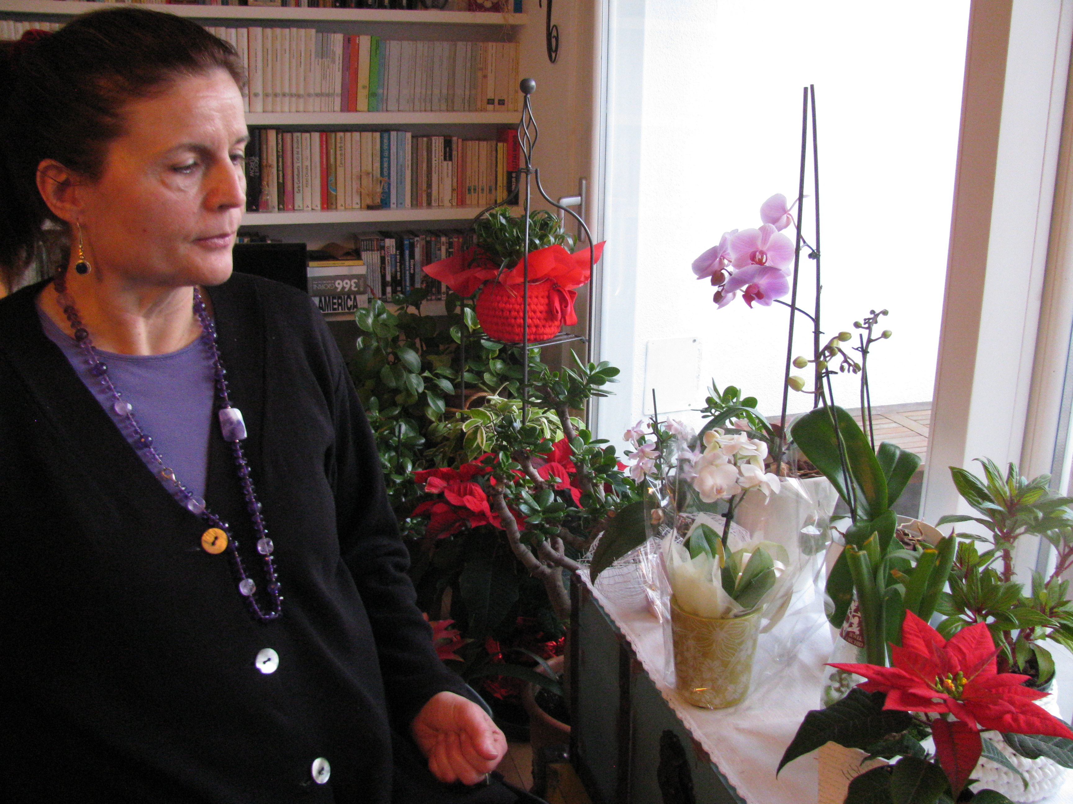 Nadia Ioriatti. Scrittrice. Per incontrarla salgo a Villazzano, sulla collina di Trento. Pochi minuti d’auto, c’è chi la fa a piedi. Mi riceve la sua aiutante filippina Connie: al terzo piano. Ok. E quindi “La signora arriva subito”. Prego … Nell’attesa mi guardo intorno. La sala non è grande, ma quanto basta. Da un lato, fiori e piante ben curate ad incorniciare una grande finestra. Giù in basso Trento, circondata dalle sua montagne. A destra scaffali: libri. Mi colpisce la lunga serie Einaudi. Li scorro, molti li ho anch’io. Altri editori fra cui Adelphi: stesso ritrovarsi con vecchi amici, libri anch’essi. E’ il primo approccio a tu per tu con Nadia e a mio avviso inizia benissimo. Ancora grazie ai libri. Già, perchè ho conosciuto Nadiagrazie al suo libro “Io tinta di aria” (Curcu e Genovese), libro che l’Autrice ha accettato di presentare anche a Librincontri al Cafède la Paix, nelle riunioni organizzate e gestite dalla mia collega blogger Gran Lettrice Mirna Moretti. E da cosa nasce cosa. Infatti non è per parlare del libro che ho chiesto a Nadia di ricevermi, libro peraltro che trovate ottimamente recensito da Mirna nel suo blog, ma per incontrare la Persona.