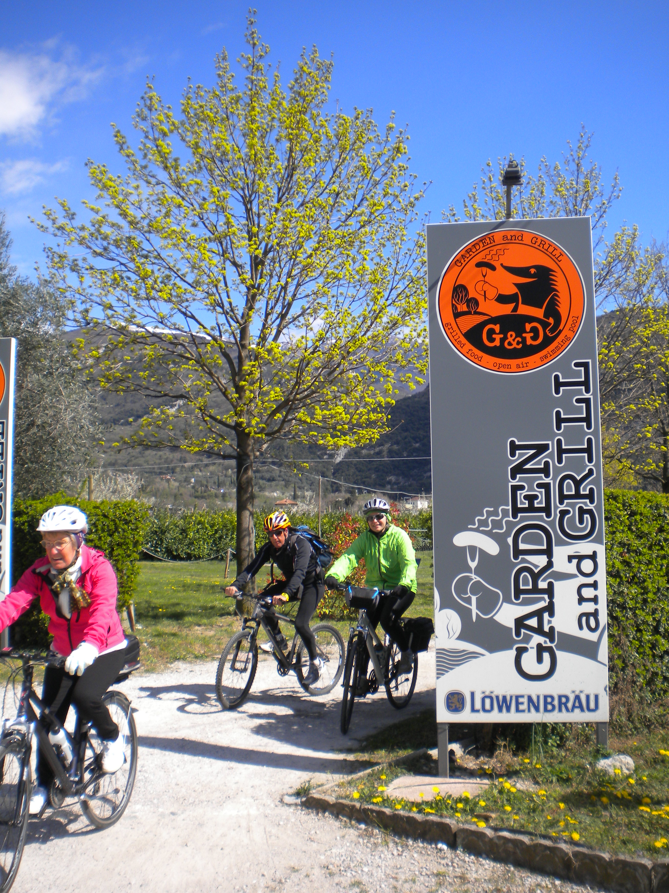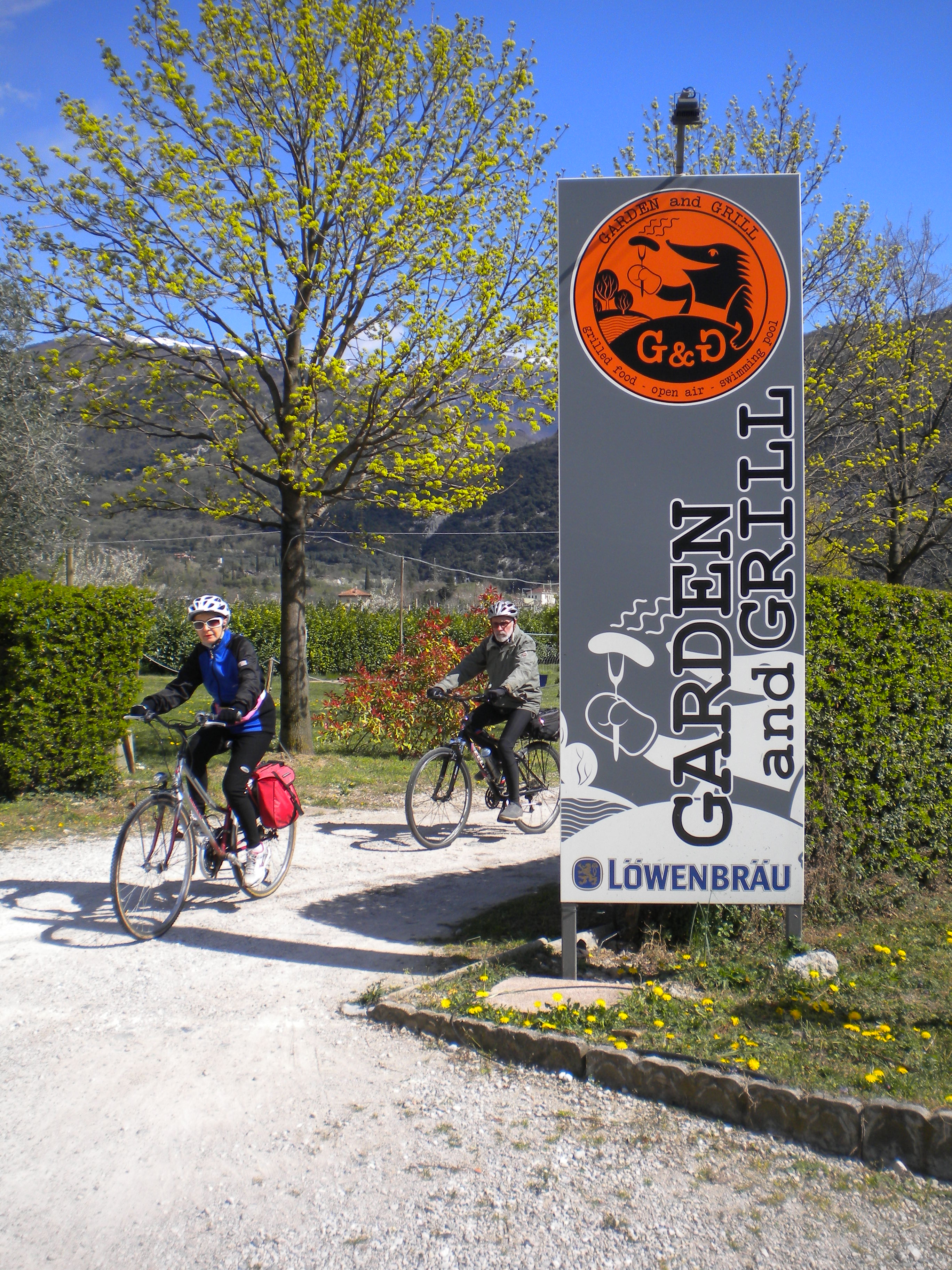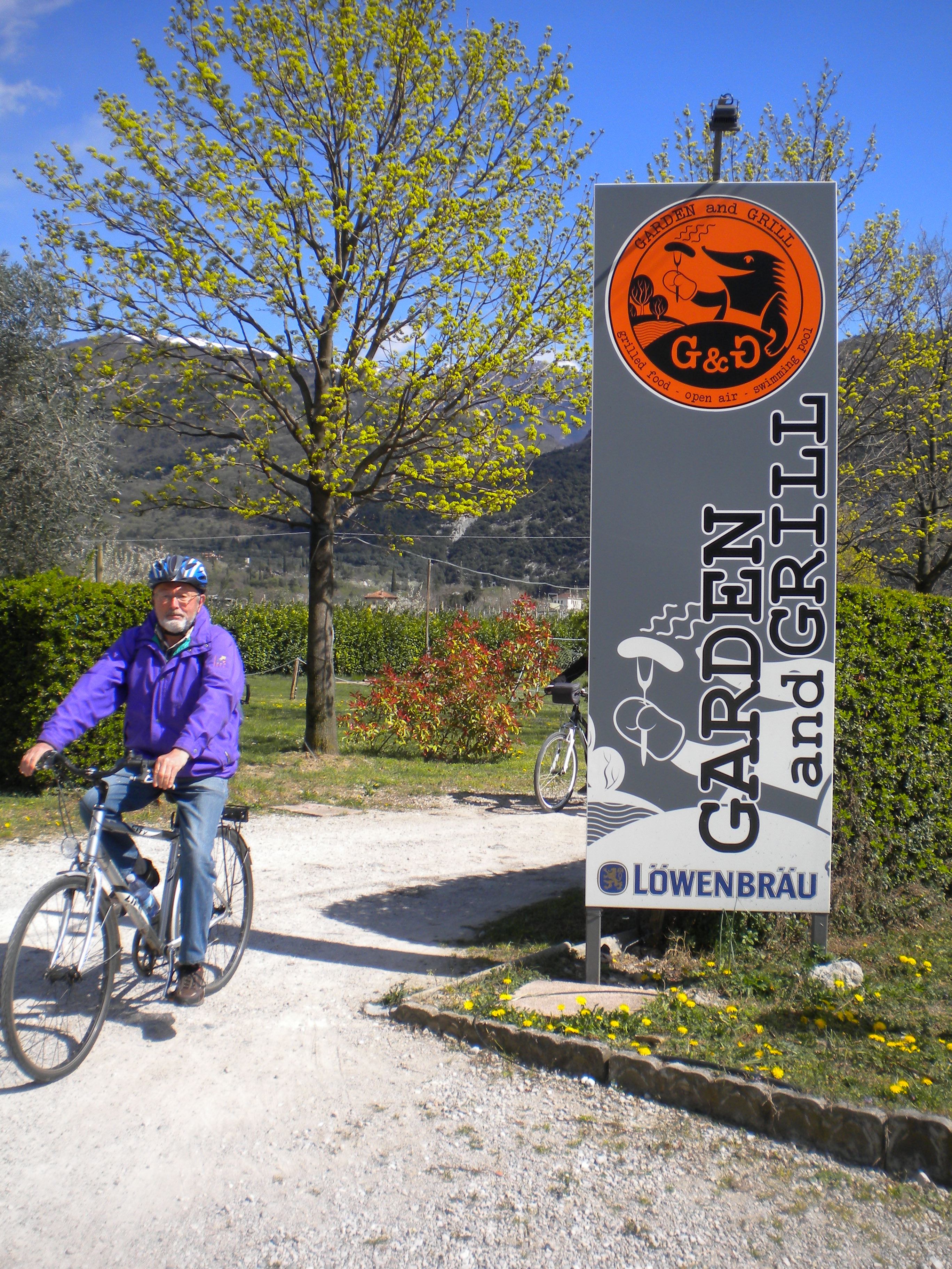 A Drò riprendiamo verso nord la vecchia strada provinciale e dopo un paio di Km ci fermiamo – a destra – al Garden and Grill di Franz-Francesco (0039 347 4974274 – 0039 335 5766809 – info@gardenandgrilldro.it): 4000 metri quadrati di verde, gazebo, poltroncine al sole, aperitivo analcolico o leggermente alcolico. Un vero relax, accompagnato dalla simpatica e gentile accoglienza del titolare. Terrò presente questo posto non solo per un aperitivo “di passaggio in biciâ€, ma anche per una grigliata all’aperto, magari venendoci in auto, perché “dopo aver mangiato, mangiato e ben bevuto …†non so come la potrei mettere con i pedali!