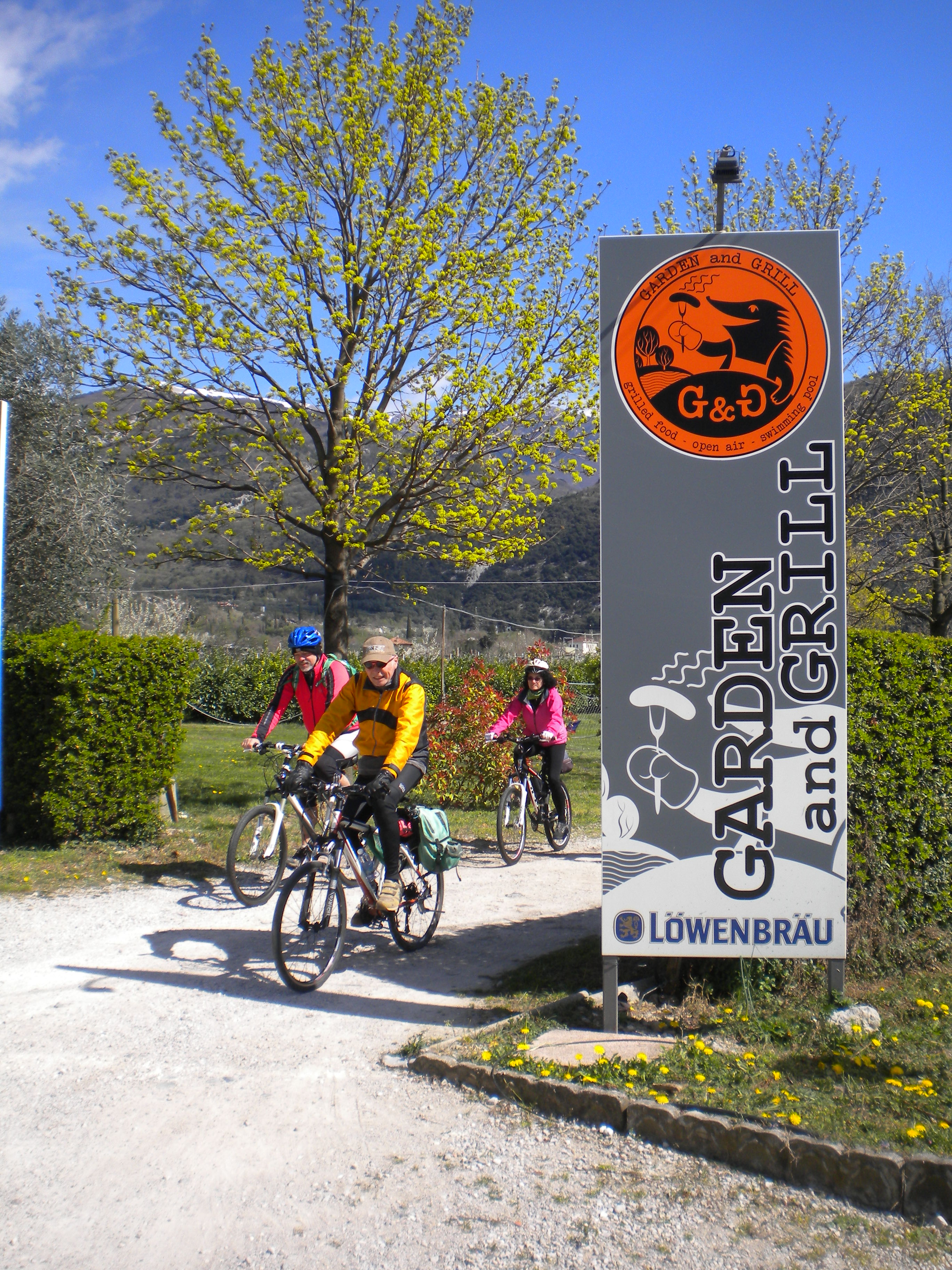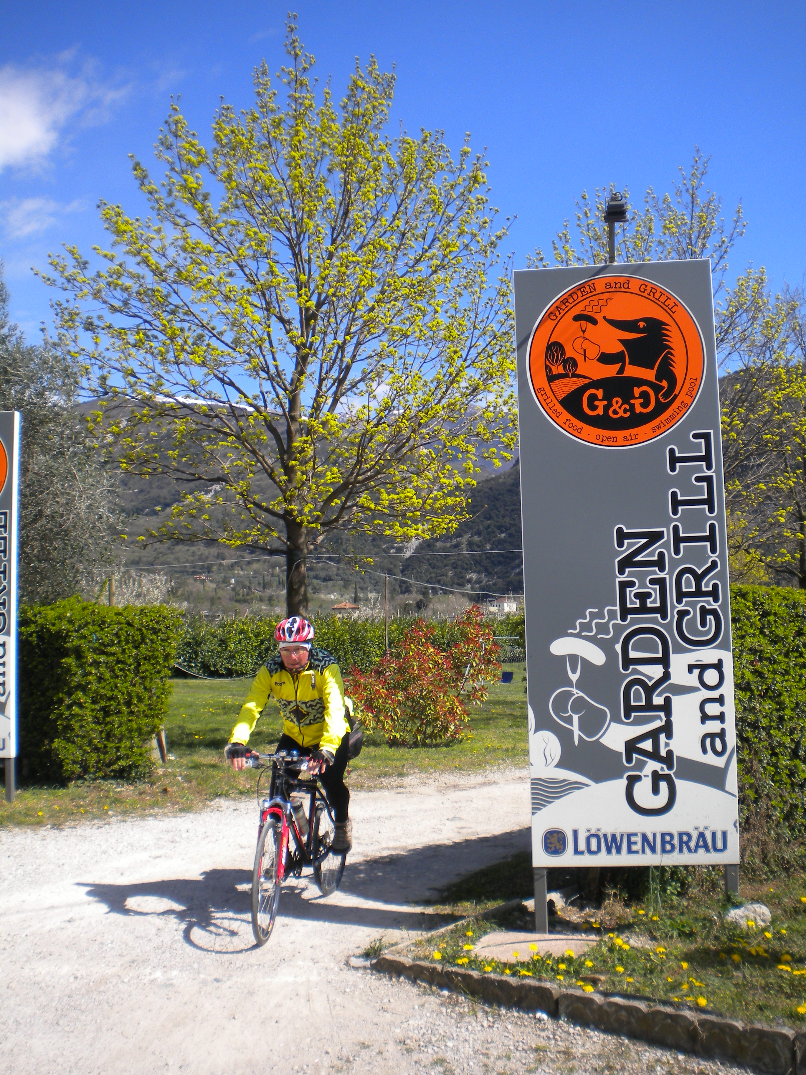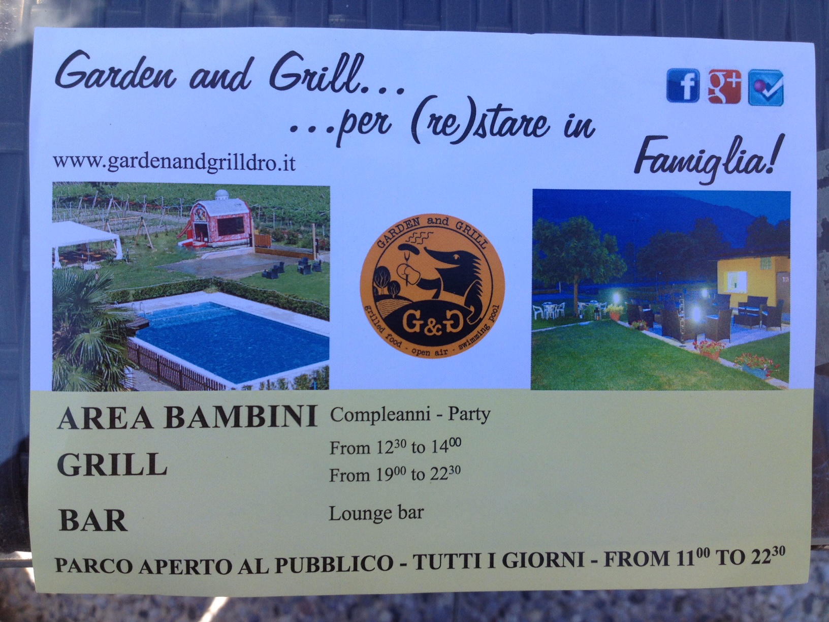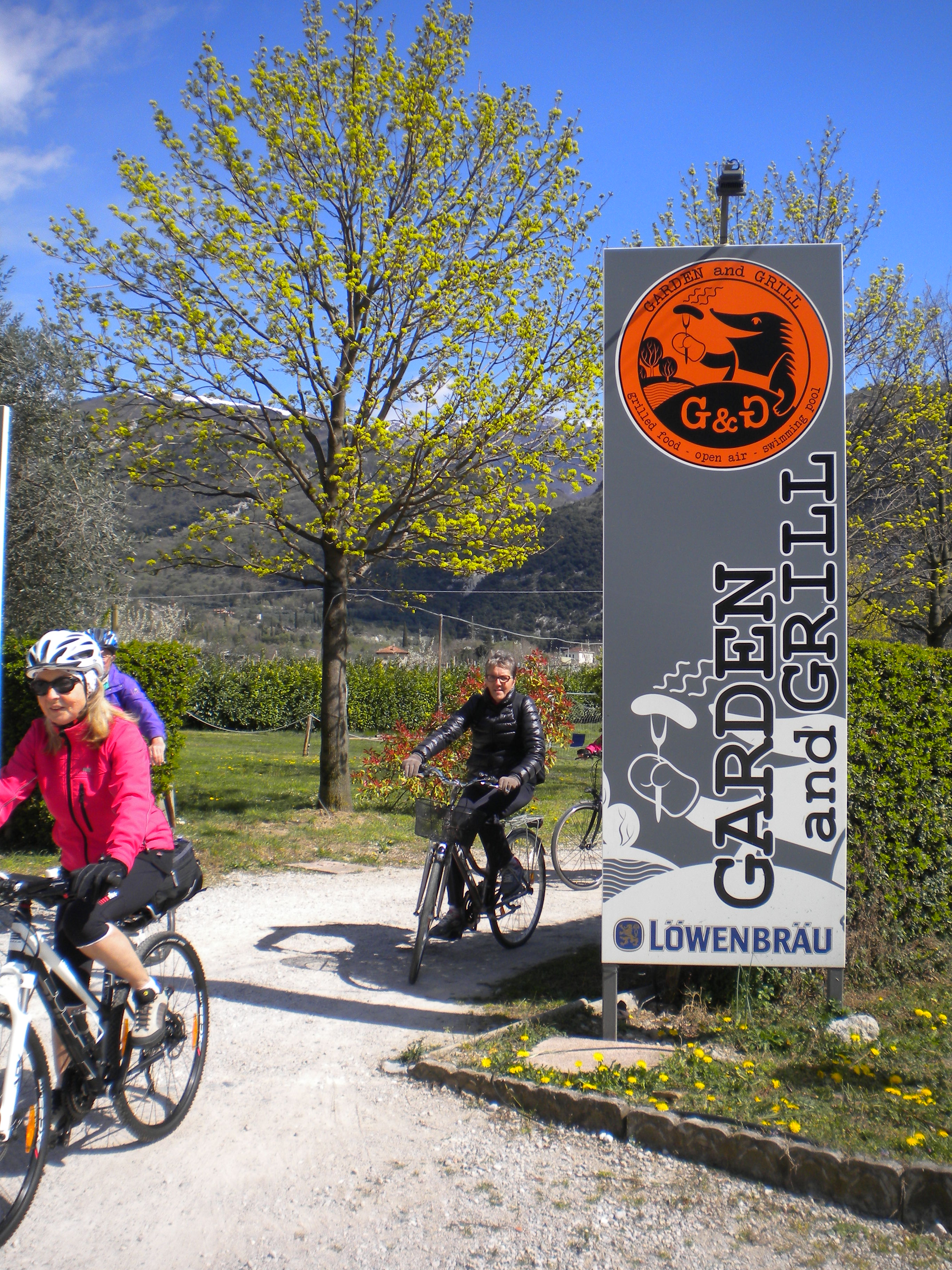 A Drò riprendiamo verso nord la vecchia strada provinciale e dopo un paio di Km ci fermiamo – a destra – al Garden and Grill di Franz-Francesco (0039 347 4974274 – 0039 335 5766809 – info@gardenandgrilldro.it): 4000 metri quadrati di verde, gazebo, poltroncine al sole, aperitivo analcolico o leggermente alcolico. Un vero relax, accompagnato dalla simpatica e gentile accoglienza del titolare. Terrò presente questo posto non solo per un aperitivo “di passaggio in biciâ€, ma anche per una grigliata all’aperto, magari venendoci in auto, perché “dopo aver mangiato, mangiato e ben bevuto …†non so come la potrei mettere con i pedali!