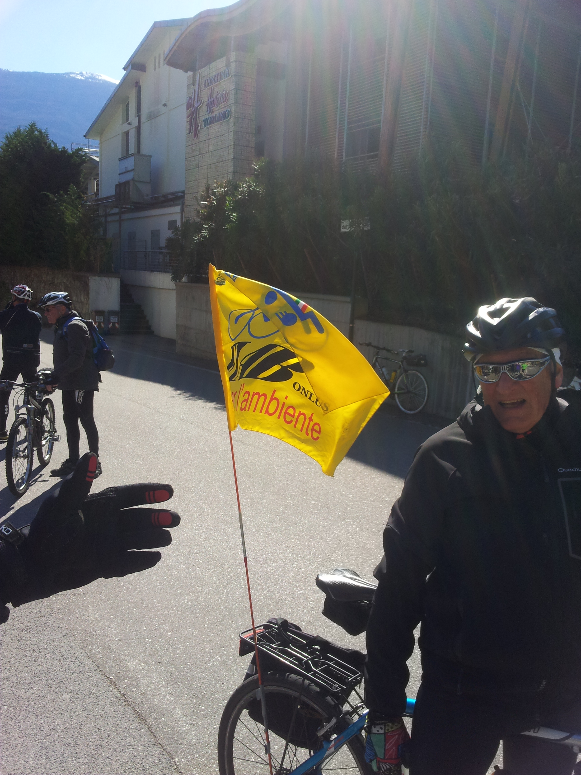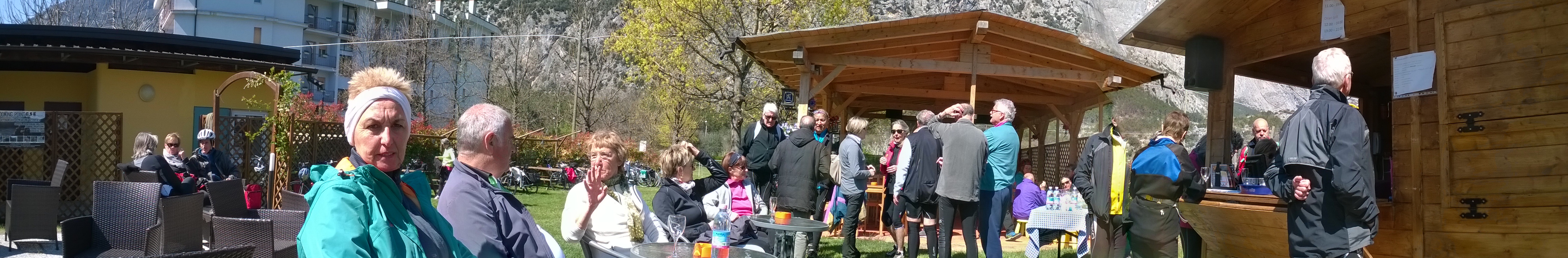 … da Dro a Dro, in gelateria. Poi, verso le 15,00 il gruppo è ripartito verso nord per risalire, lungo la provinciale, al Lago di Cavedine (una scommessa: giunti al bar-Centro Velico di Andrea Danielli si saranno fermati per una sosta. Poi verificheremo …) e quindi a Sarche. Io, solo soletto, con la mia bandiera “FIAB†assicurata al portapacchi, in leggera discesa ma controvento – nel frattempo si è alzata l’Ora del Garda – sono tornato a Riva del Garda, dopo 54,5 km.