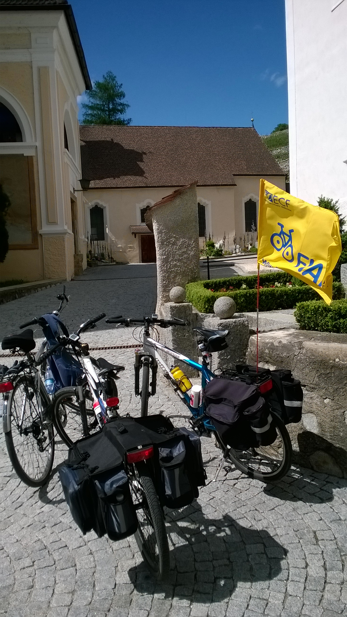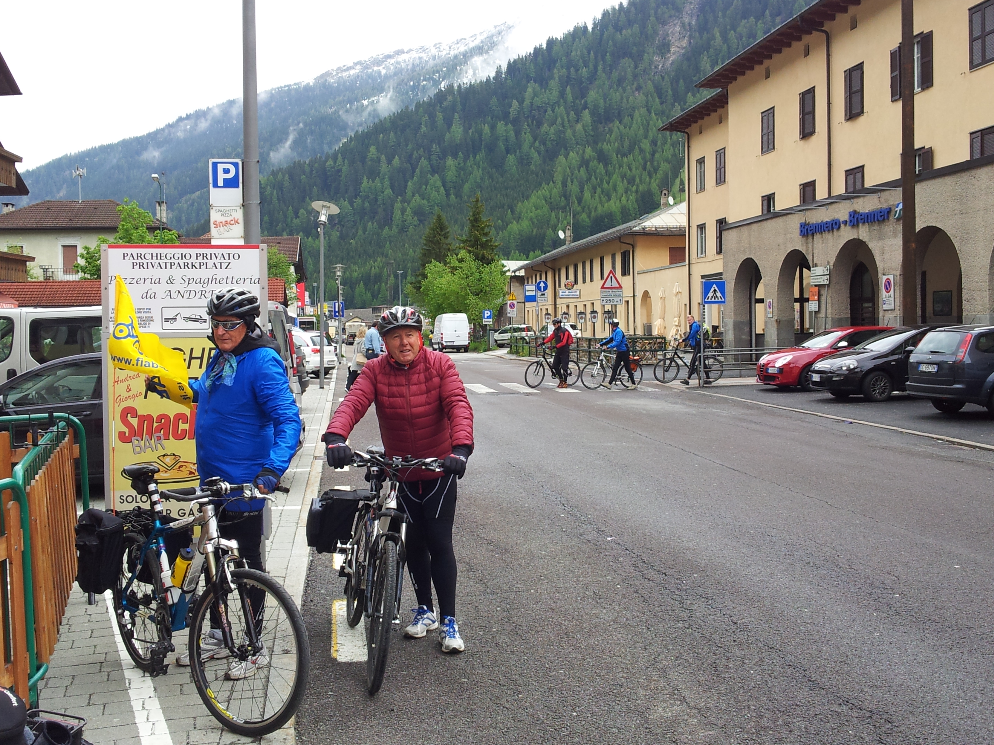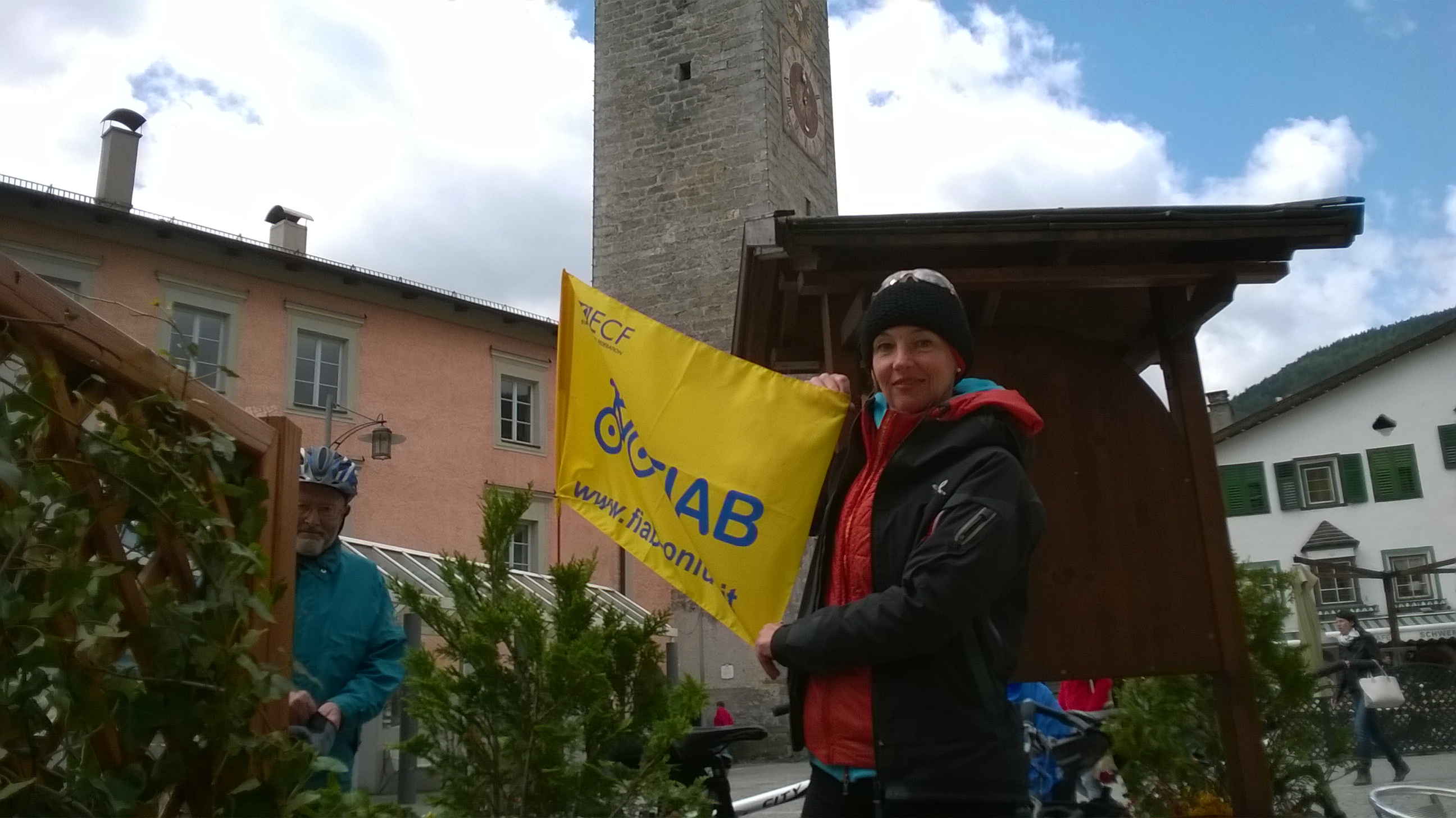 Sterzing. ci concediamo una cioccolata calda ed una foto con una giovane bella signora tedesca attratta … dalla nostra bandiera FIAB (Giovanni sbircia!). Poco dopo arriva suo marito … bici elettrica (lei no!) e ci guarda con sospetto …
