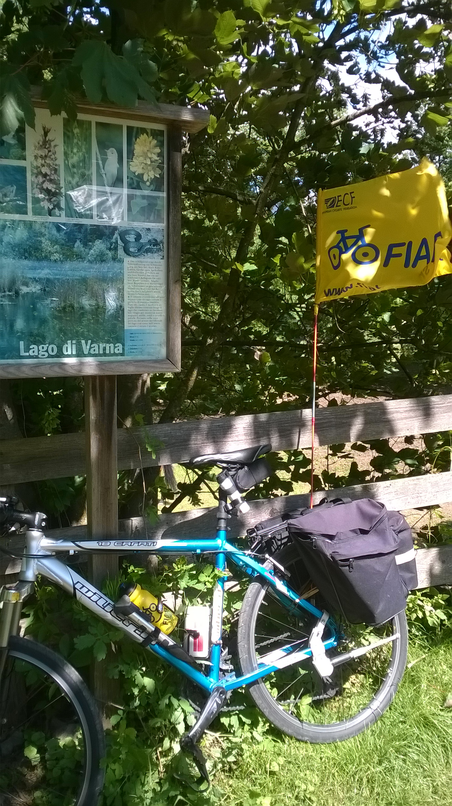 Prima di Fortezza, lavori incorso, ci distraiamo, sbagliamo strada, arriviamo in cima ad una ripida, corta salita asfaltata, domandiamo informazioni: “ Zuruck erste rechtâ€, indietro la prima a destra. Non l’avessimo mai ascoltato! Ci troviamo immersi in un percorso boschivo da mountain biker professionisti: certe salitacce che superiamo spingendo le bici … Insomma, dopo tanto sudare finalmente riguadagnamo la ciclabile vera. Saliscendi a fianco del lago di Fortezza, il bosco di Varna, il laghetto di Varna, nel quale mi tuffavo per rinfrescarmi “fra le oreâ€, ovvero nell’intervallo di mezzogiorno, quando ero Sottotenente di complemento della Brigata Alpina Tridentina (1969: vecchio laghetto quanto tempo è passato, quanti ricordi fai rivivere tu …). Ora ci hanno messo un recito, un bar, un camping etc.. peccato, non è più lui.