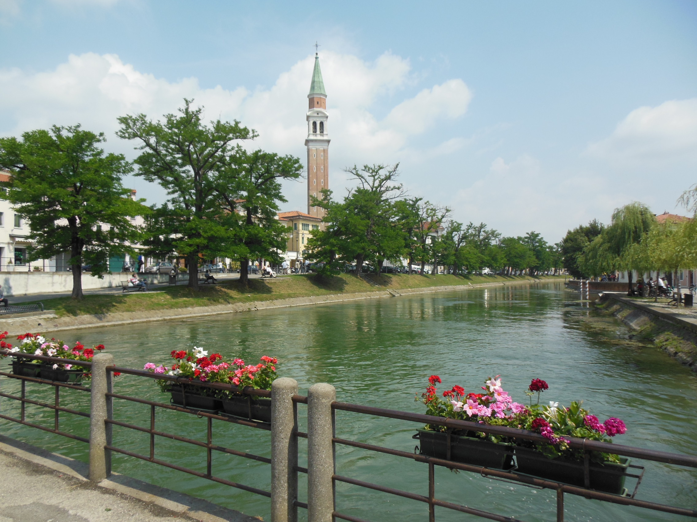 1 giugno, 72 km. Sole e caldo, bene! Verso sud, Ciclopista del Brenta, bellissima ma poco e mal segnalata, peccato! Visitiamo, con guida, Villa Contarini, una delle più grandi ville venete. Di aspetto barocco, è situata a sfondo della piazza principale di Piazzola sul Brenta (PD). Notevole la “Sala della Musica” il cui soffitto arriva sino al tetto, e che in alto, sulle pareti laterali presenta una serie di balconate sull’ultima delle quali prendeva – invisibil agli sguardi – posto l’orchestra: il suono saliva verso l’alto, arrivava al soffitto e fungeva da cassa armonica, e quindi si diffondeva amplificato verso il basso a stupire gli ospiti.