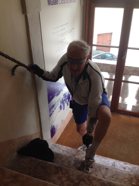 31 maggio, 57 km. Tempo fresco. Da Trento a Borgo Valsugana noi in treno le bici in furgone, indi si pedala. Sosta a Valstagna per visita al Museo Etnografico “Canal di Brentaâ€. Si prosegue per una sosta pranzo al sacco nei ristoranti-bar  in località Cornale (e intanto – saggiamente – si sfoga un temporale). Arrivati a Bassano del Grappa, diretti all’ostello – molto forse troppo spartano, ma una notte vabbè – Dopo cena, passeggiata con gelato. (Qui a lato: approfittiamo delle scale del museo per alleggerirci degli scaldamuscoli).