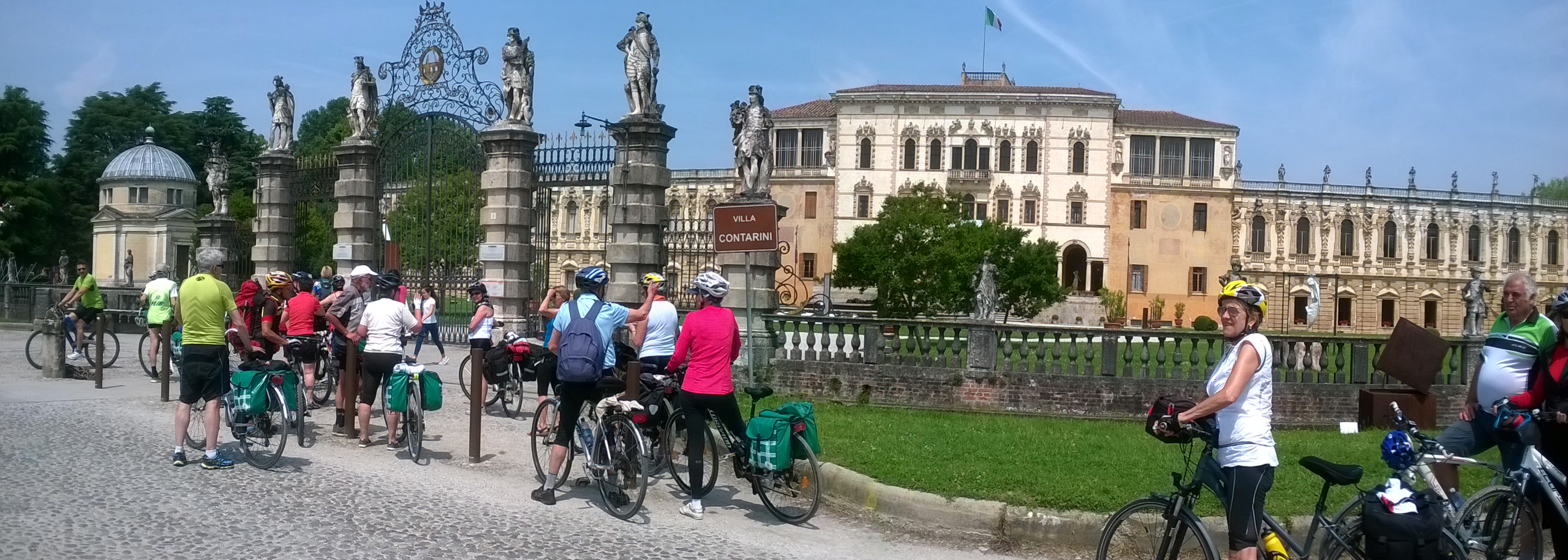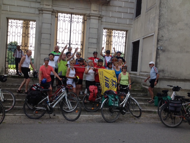 Mentre percorriamo l’argine sinistro del Brenta, veniamo salutati da un gruppo di ciclisti che pedalavano sull’argine opposto: hanno visto le nostre tre bandiere: “Siamo FIAB anche noi, FIAB Milano!” Grande festa! Cu ritroveremo più avanti nel corso della visita ad una villa.