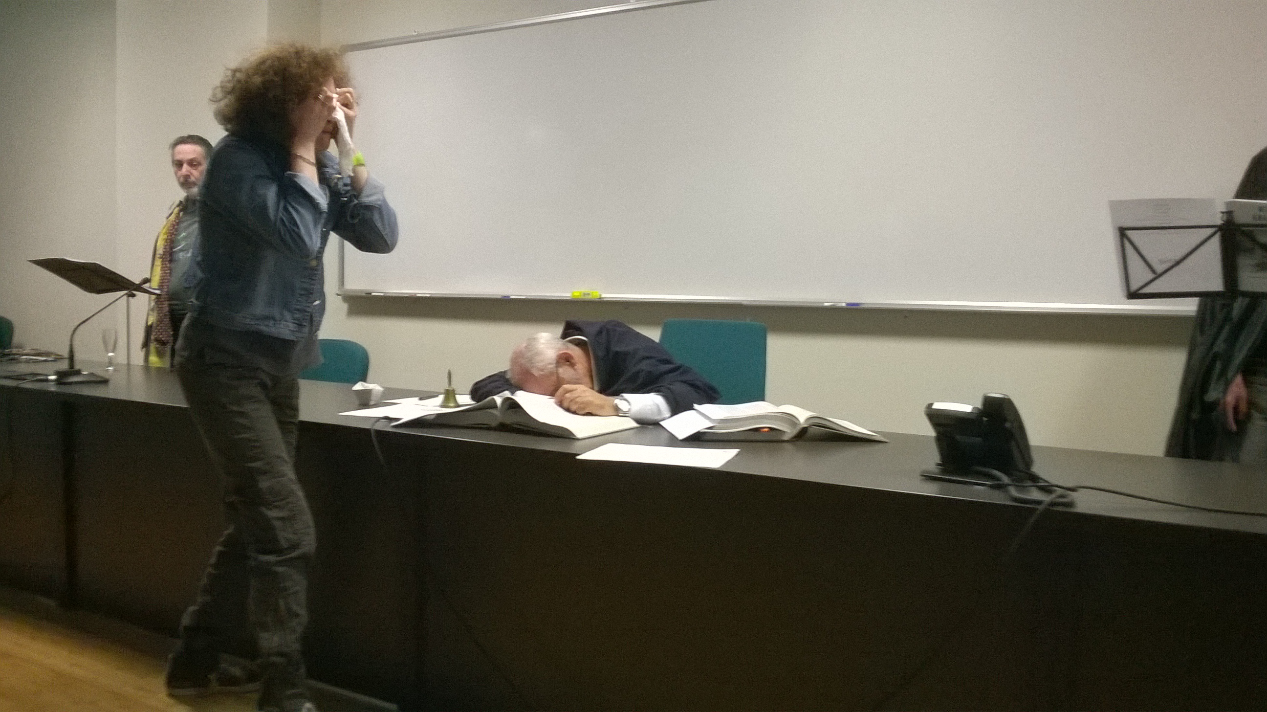 Con la tragedia greca si è iniziato, con il teatro (greco e) latino si finisce. Infatti ecco il “deus ex machinaâ€, l’escamotage che risolve la situazione: il Presidente del Tribunale non dorme più. Muore. Processo interrotto, anzi nullo. Tutti a casa. L’imputato si dispera.