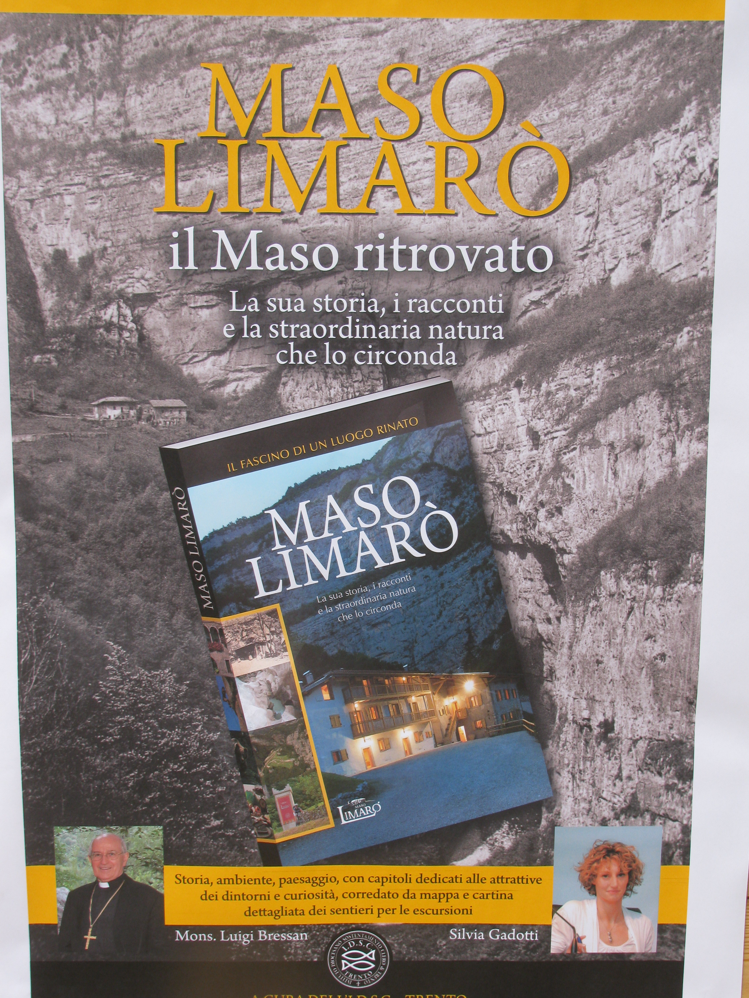 .… oggi al Maso è stato presentato il libro “Maso Limarò†– Il fascino di un luogo rinato, a firma del Vescovo di Trento Mons. Luigi Bressan e della giornalista Silvia Gadotti. Limarò, da “Limesâ€, confine fra il Principato Vescovile di Trento e la Contea di Arco, si trova sul bordo di una Forra, un profondo canyon scavato dal Sarca che scende da Madonna di Campiglio, 6,5 km per 250 metri di profondità . Perché il Vescovo? Perchè il Maso è di proprietà di un Ente della Curia, presieduto da un mio vecchio conoscente,  Gianni Benedetti, ed è dato in gestione a privati, i simpatici ed attivissimi Enzo e Stefania.