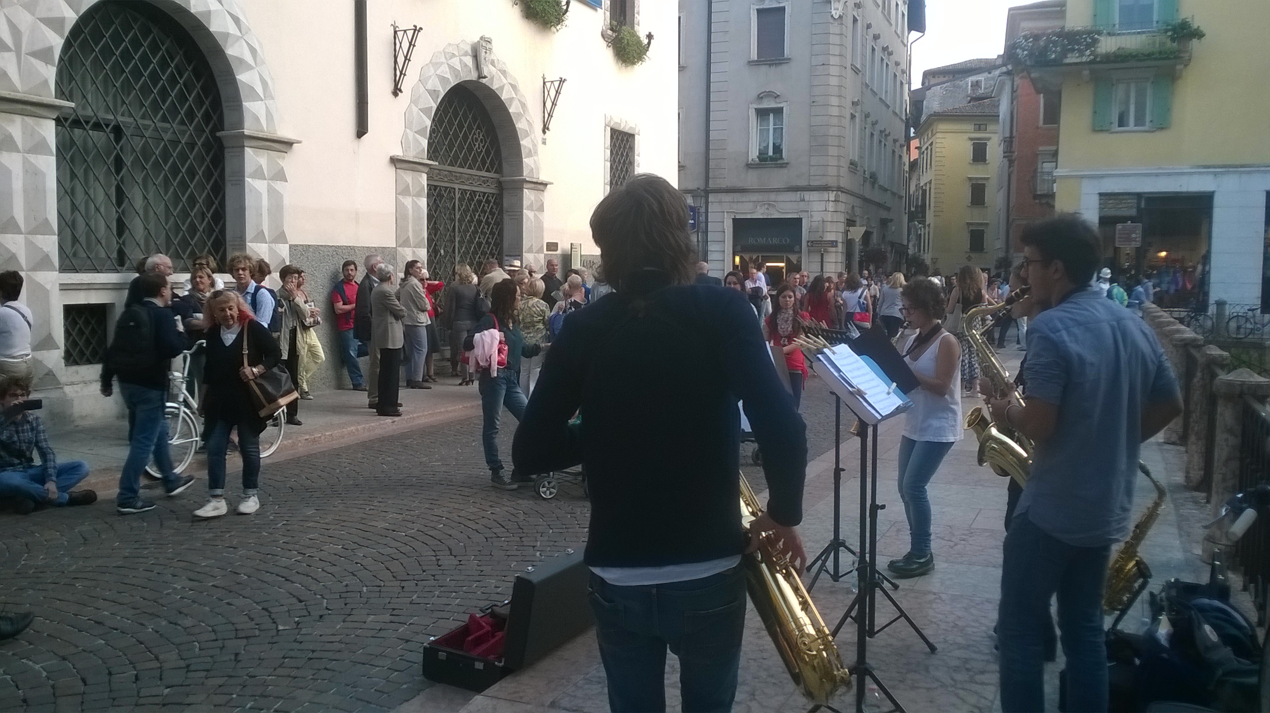 Siamo tutti lì, davanti alle tre entrate … già , perché trovando chiusa quella usuale, siamo corsi aventi e indietro per capire se l’entrata non fosse una delle altre due. E invece no. Pian pianel si scopre che gli addetti “si sono dimenticati†che c’era il concerto: porte chiuse. Aspettiamo 40 minuti, durante i quali ci godiamo il concerto. No, non quello, bensì un altro, un “concerto di strada†eseguito da quattro sax giovani, i giovani allievi del Conservatorio (?). I loro nomi? Ho dato loro le indicazioni del mio blog, me li diranno presto.