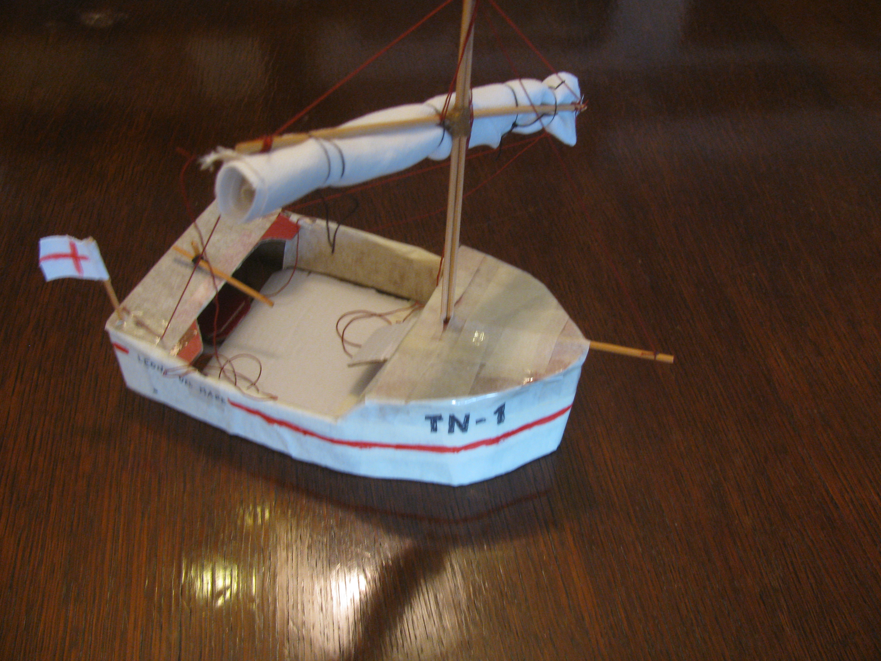 Acc…. dimenticavo … il mio vicino di pianerottolo …   è il suo compleanno  … il suo primo! Ho pensato di ragalargli una barca. L’ho costruita io, scafo in strati sovrapposti (di cartone e nastro adesivo) un motorsailer dal nome avventuroso “Leone del mare”. Già … perchè lui si chiama Leone: auguri, Leone!