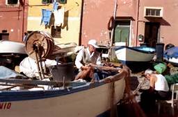 Dal muretto sovrastante il minuscolo scalo, un amico del pescatore, sigaretta fra indice e pollice, scuotendo via la cenere con il dito medio, apostrofa serio serio (con tono ironico) il collega già in acqua: “Tei ghe missu u lesu?” Traduco: “Ti sei ricordato di mettere il tappo (leso) sul fondo dello scafo, quello che usualmente si toglie a terra per svuotare completamente lo scafo, e che invece, quando la barca è in acqua, deve essere ovviamente posizionato al suo posto, pena l’affondamento?”  La bellezza della sinteticità del dialetto!