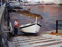 Ilios ed io abbassiamo lo sguardo ed in silenzio osserviamo i movimenti a loro volta silenti, rituali e quasi sacri di alcuni vecchi pescatori, pescatori vecchi. Ognuno di essi, a turno, si avvicina al proprio gozzo, lo conduce per mano al piccolo scalo, ne assicura una estremità alla carrucola ancorata al muretto e quindi, lascando lentamente una cima, con un gesto amorevole lo accompagna a scivolare in acqua. In cima allo scalo, di lato resta il carrellino  a testimoniare che una barca, quella barca,  è uscita in mare: ogni pescatore infatti riconosce ogni carrellino, la sua barca, il suo padrone, i parenti del suo padrone: non si sa mai … tutto ha una sua funzione. Il gozzo si adagia sull’acqua, accomodandosi con un lieve rollio, soddisfatto al pari di una signora che finalmente abbia trovato sul tram un posto libero ove sedersi. Gli scogli sono vicini ma i pescatori hanno stipulato un accordo con quel poco di mare di cui dispongono: loro lo amano e lo rispettano ed “egli†frena gli scafi e li preserva dagli urti.