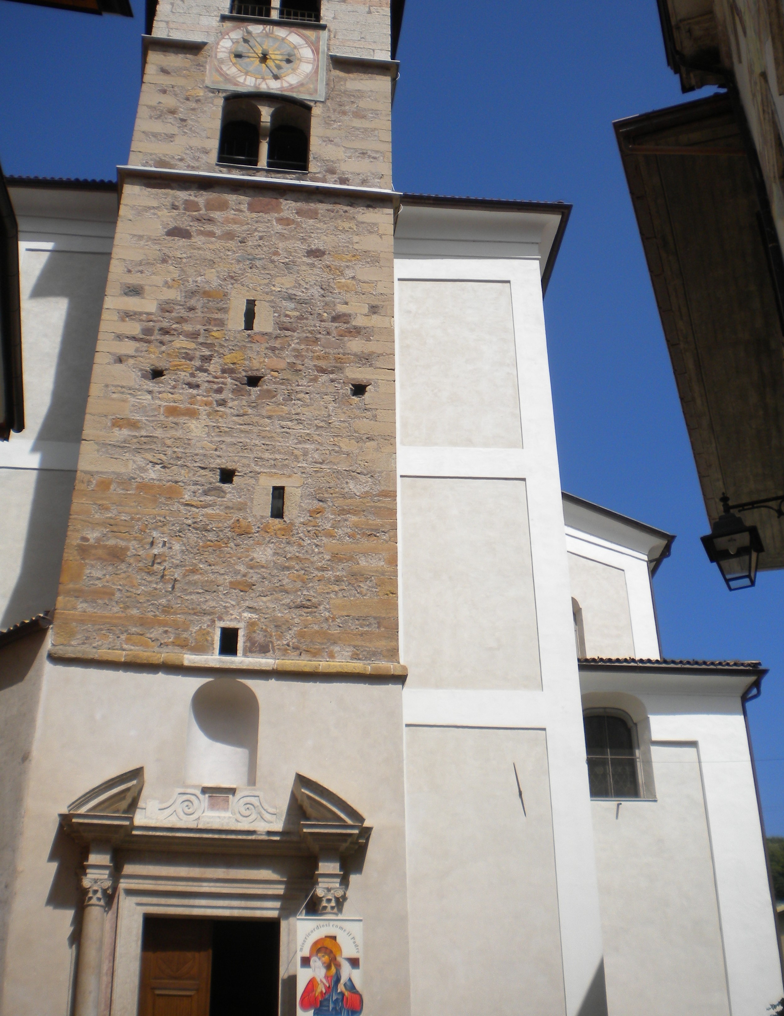 La chiesa. Edificata come primissima struttura nel 1100 (imperatori Ottoni), modificata e completata dal 1400 al 1604. La “cipolla†terminale è invece del 1700. Si contraddistingue per un particolare tipico dell’arte nordica, ovvero per l’ingresso attraverso il campanile, per di più rialzato rispetto al pano stradale. Essa è edificata sull’ultimo sperone della riva rocciosa del fiume Avisio, ed è sorta ben prima della città stessa di Lavis, città che come è noto fu anche il confine fra il Principato Vescovile di Trento e la Contea del Tirolo. Chiesa e campanile di confine, quindi. Il portale della chiesa è del 1740, opera dell’Architetto roveretano Sartori, progettista fra l’altro della Chiesa di Gries. A fianco dell’entrata del Campanile/chiesa ve ne era una seconda, oggi murata.