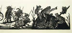 Dell’ Anonimo (pseudo) Omero (ovvero non si sa chi sia stato): “Batracomiomachia†la guerra fra i topi e le rane. Si tratta di tre canti per un totale di circa 75 sestine il che significa circa 450 versi (reperibile in internet. Traduzione di un giovane studentello: tale Giacomo Leopardi). L’autore – sconosciuto – conosce e “lavora†bene il prodotto letterario altrui e si diverte a rovesciare ironicamente il poema epico, con una tempestività insolita rispetto al prodotto originale.