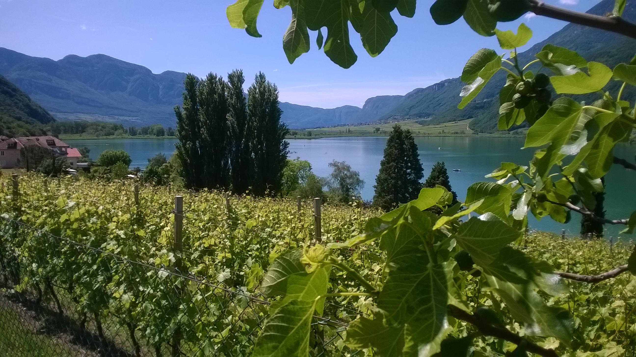 Ultimo tratto: l’azzurra vision di … no, non di S. Marino, ma del lago di Caldaro. A destra, in altro, i contrafforti della Val di Non. In totale 47 km. Non abbiamo tempo di salutare l’amico Otto che gestisce il casotto di vendita mele e frutti vari e via di corsa vieder nach Trient dove ci aspettano per pranzo.