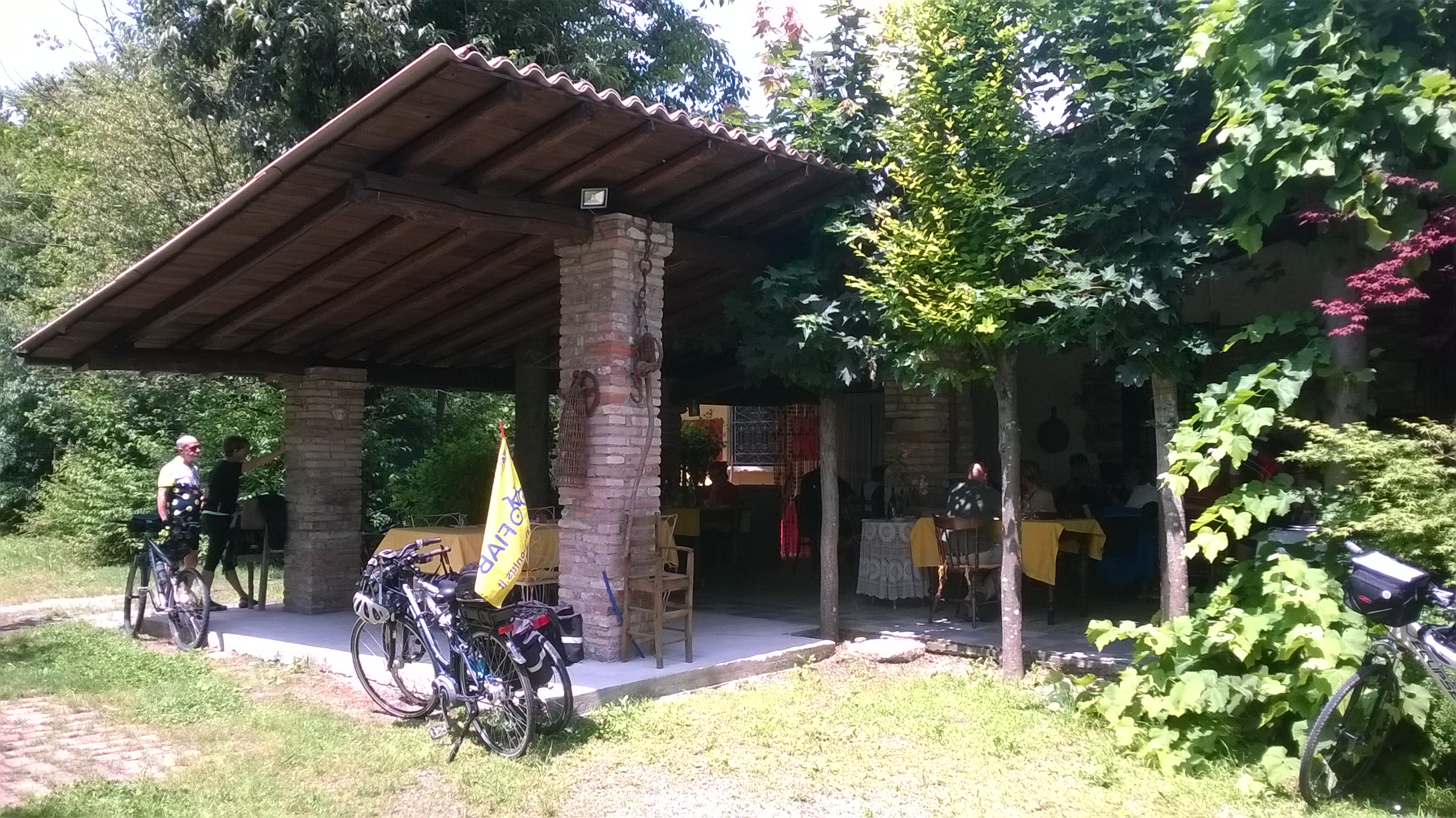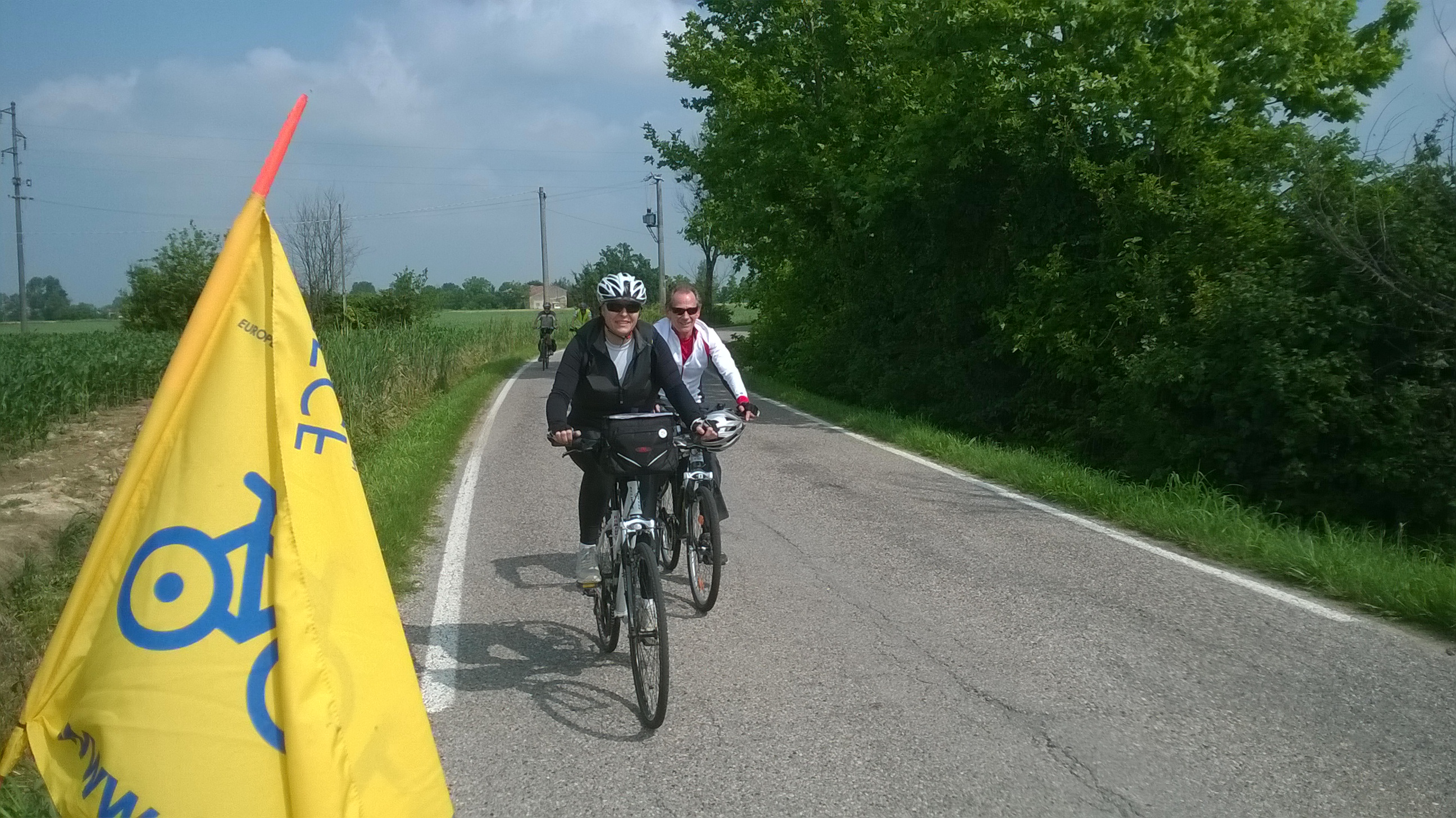 In meno di due ore da Trento a quasi Curtatone (col pullman, ovviamente!). Indi le ciclabili e strade assai poco frequentate, prima a livello della campagna, poi sui poderosi argini dell’Oglio e del Po. La dolcezza di curve armoniose di un percorso dipinto dal verde dei campi e dall’azzurro di un cielo trapunto di bianche e innocue nuvole.