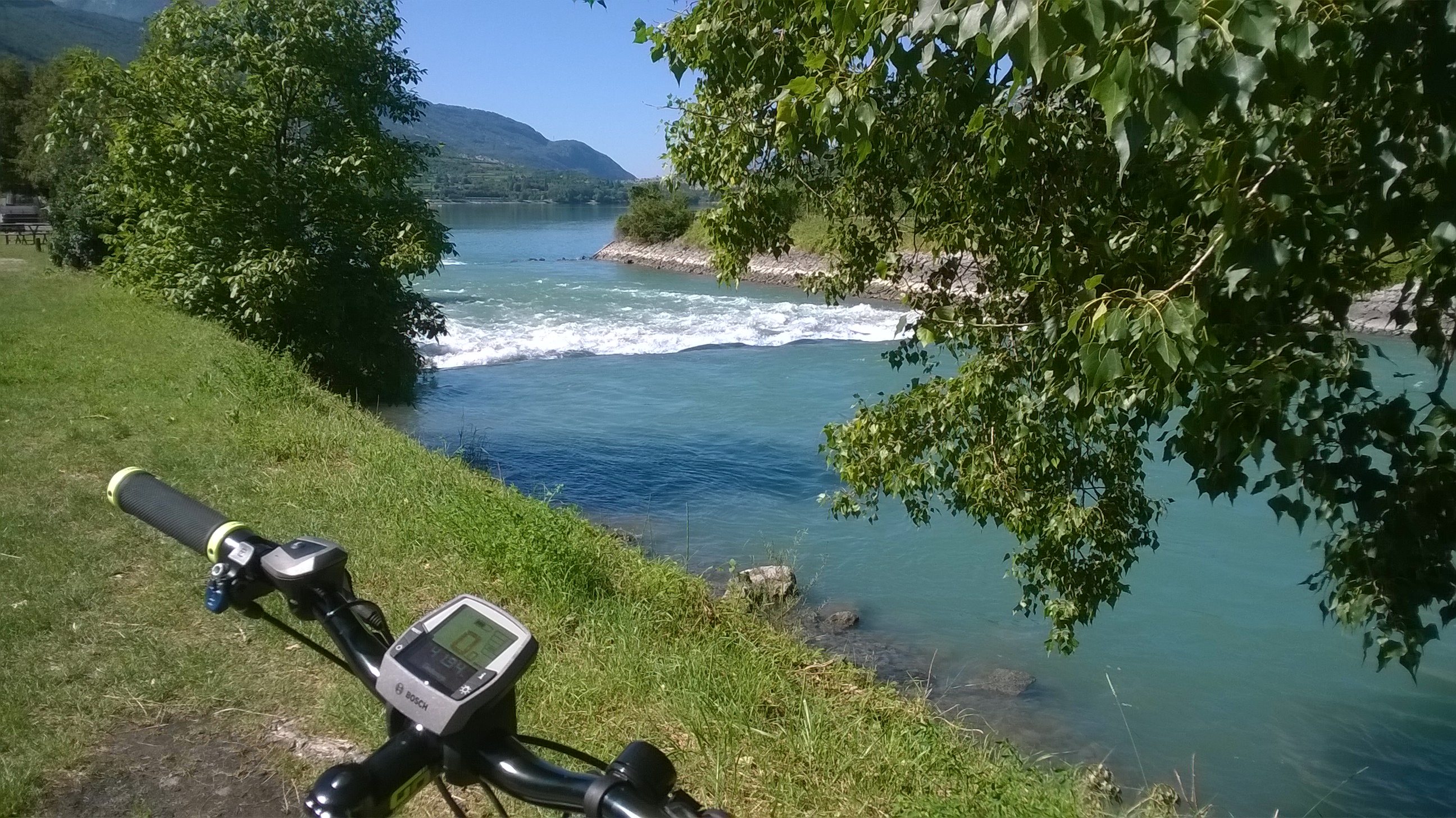 Dopo la salita, sono sceso dall’altro versante, verso nord: Fiavè, Ponte Arche, Maso Limarò, Lago di Cavedine, Dro, Arco, Riva del Garda, totale 65 km. Nella seconda parte del percorso, per testare la durata della batteria, anche se non ne avevo bisogno ho utilizzato sempre la modalità tour anziché la eco (la eco sopperisce al maggior peso della bicicletta e vi regala inoltre un piccolo vantaggio aggiuntivo). Alla fine, avevo a disposizione una potenza elettrica residua del 30 % sul totale, pari a circa 45 km in regime eco – devo intendere:  in pianura – . Quindi, quei 150 km di “buono” che vi indica il computer a batteria carica, sono abbastanza veritieri per percorsi che non prevedano salite lunghe e ripide sempre che facciate lavorare anche vostre le gambe!. Infatti, se utilizzate modalità “potenti” (sport-turbo) potete usare alla ruota rapporti più duri, più veloci: faticate molto meno ma 1) non fate esercizio fisico; 2) consumate presto la carica elettrica.