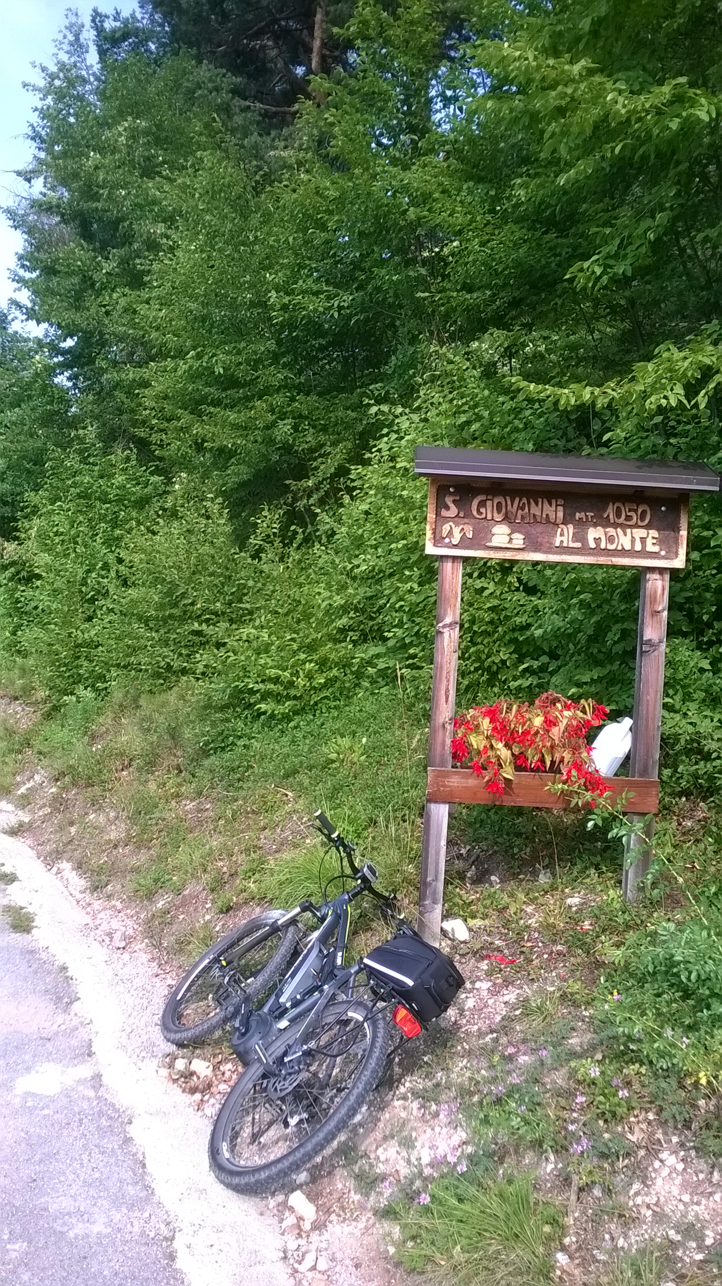 Da Arco (70 m lm) ad oltre il Rifugio S. Giovanni al Monte (m 1070 lm): dislivello di 1000 m in 11,5 km. I primi 4 km sono al 15%. Poi “spiana” al 9 – 12%. Tempo Impiegato, 1h 20′ alla media di circa 10 kmh. Frequenza cardiaca all’arrivo: 105 battiti al minuto. Livelli di “aiuto elettrico” utilizzati: tour con punte di sport. Riserva elettrica ancora disponibile all’arrivo:  due tacche su cinque (40%) pari a km 50/40/30, rispettivamente  in modalità eco/tour/sport – devo intendere: in pianura.