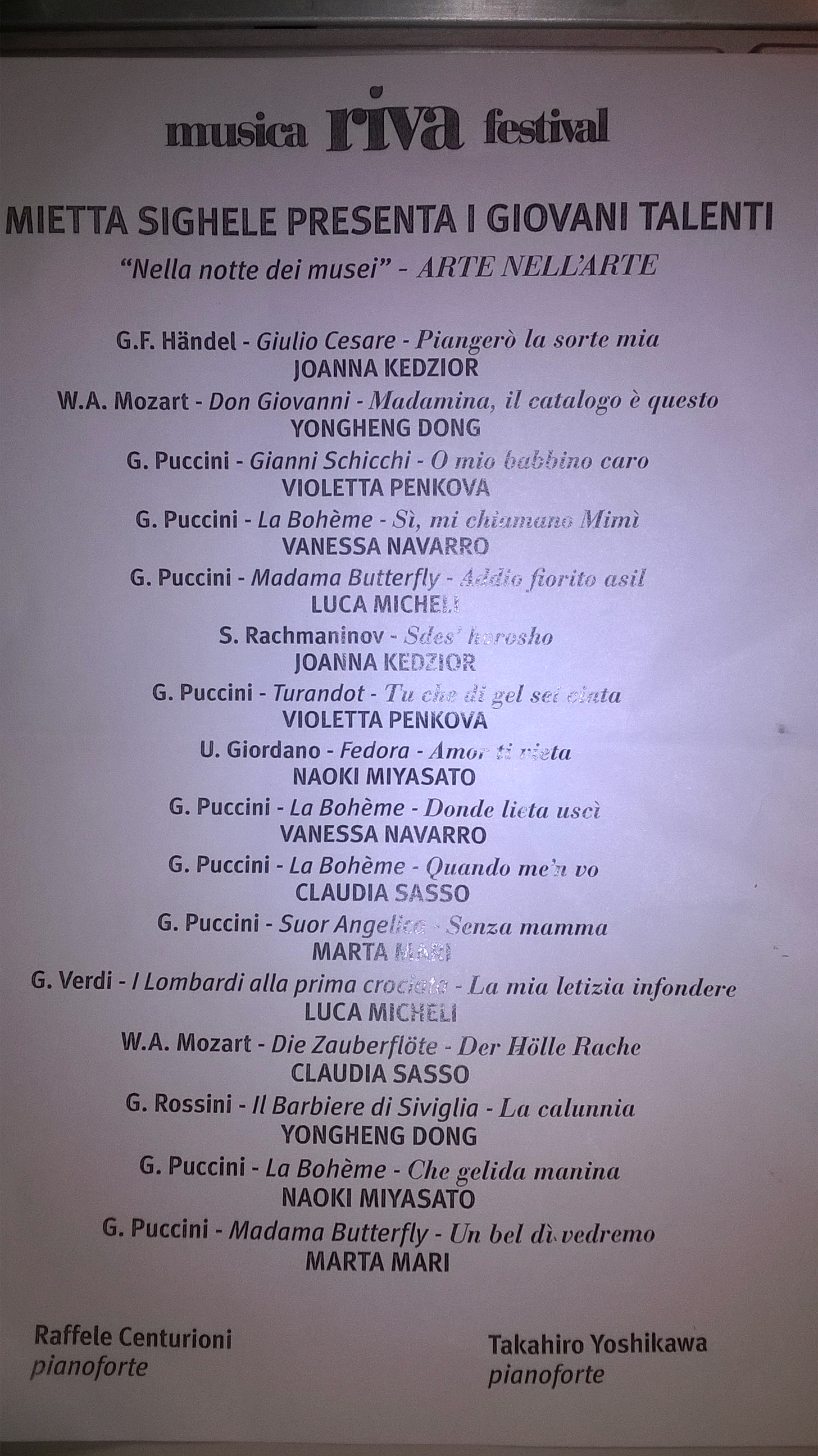 I cantanti: tutti bravi, ovviamente chi più e chi meno. Non sta a me premiare con una sottolineatura chi io abbia reputato migliore di altri. Mi limito a citare i due brani che maggiormente mi hanno coinvolto: al primo posto, “Che gelida manina†dalla Boheme di G. Puccini, cantata da Naoki Miyasato e a pari merito “Die Zauberfloete – Der Hoelle Rache†di W.A. Mozart cantata da Claudia Sasso.