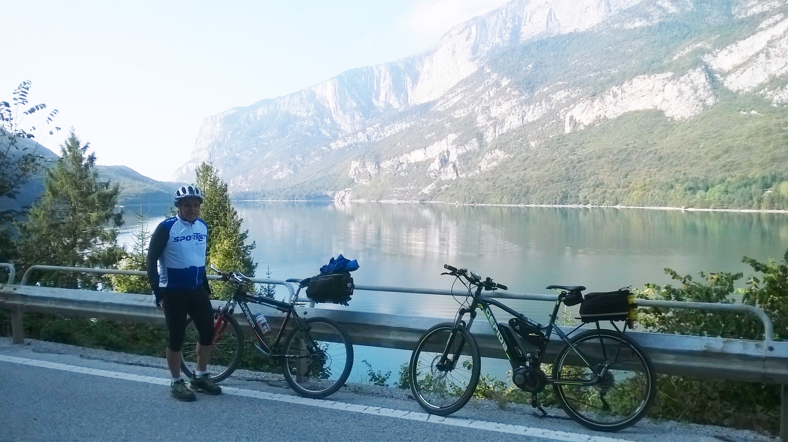 Da Trento (ore 08,00) in auto fino a Terlago e quindi a  Covelo, Ciago, Lon,  Ranzo. E già qui ne sarebbe valsa la pena. La strada. Scolpita nel fianco della montagna, stretta, a strapiombo. Sei sulla verticale dei tuoi percorsi usuali: il Lago di S. Massenza e soprattutto il Lago Toblino con il suo castello, tanto per citare il più famoso. A Ranzo, sono le 09,00, iniziamo a pedalare in salita, muscoli freddi. Dapprima su asfalto, poi su sterrato: e qui la verticale è sul Maso Limarò: uno spettacolo! Infine nel bosco. La strada diventa sentiero, il fondo ghiaioso e sassoso. Ripidi saliscendi si alternano a tratti pianeggianti. La mia bici è una mountain bike a pedalata assistita (per fortuna!): tuttavia monta pneumatici non scolpiti, quelli “da città †che mi creano qualche problemino. Ma tant’è sono in ballo e devo ballare. Fausto no, non è “assistito elettricamente†ma lui non ne ha bisogno: è’ molto più “forte†di me, più allenato ma non mi fa pesare questa differenza, è un vero signore, discreto e comprensivo con una persona anziana (infatti io ho ben un anno più di lui!). Con una ripida picchiata asfaltata di 800 metri, ci innestiamo sulla strada provinciale che sale da Sarche al Lago di Molveno e ci immettiamo a sinistra sul sentiero che costeggia, sovrastandola, la sponda destra orografica (occidentale) del lago.