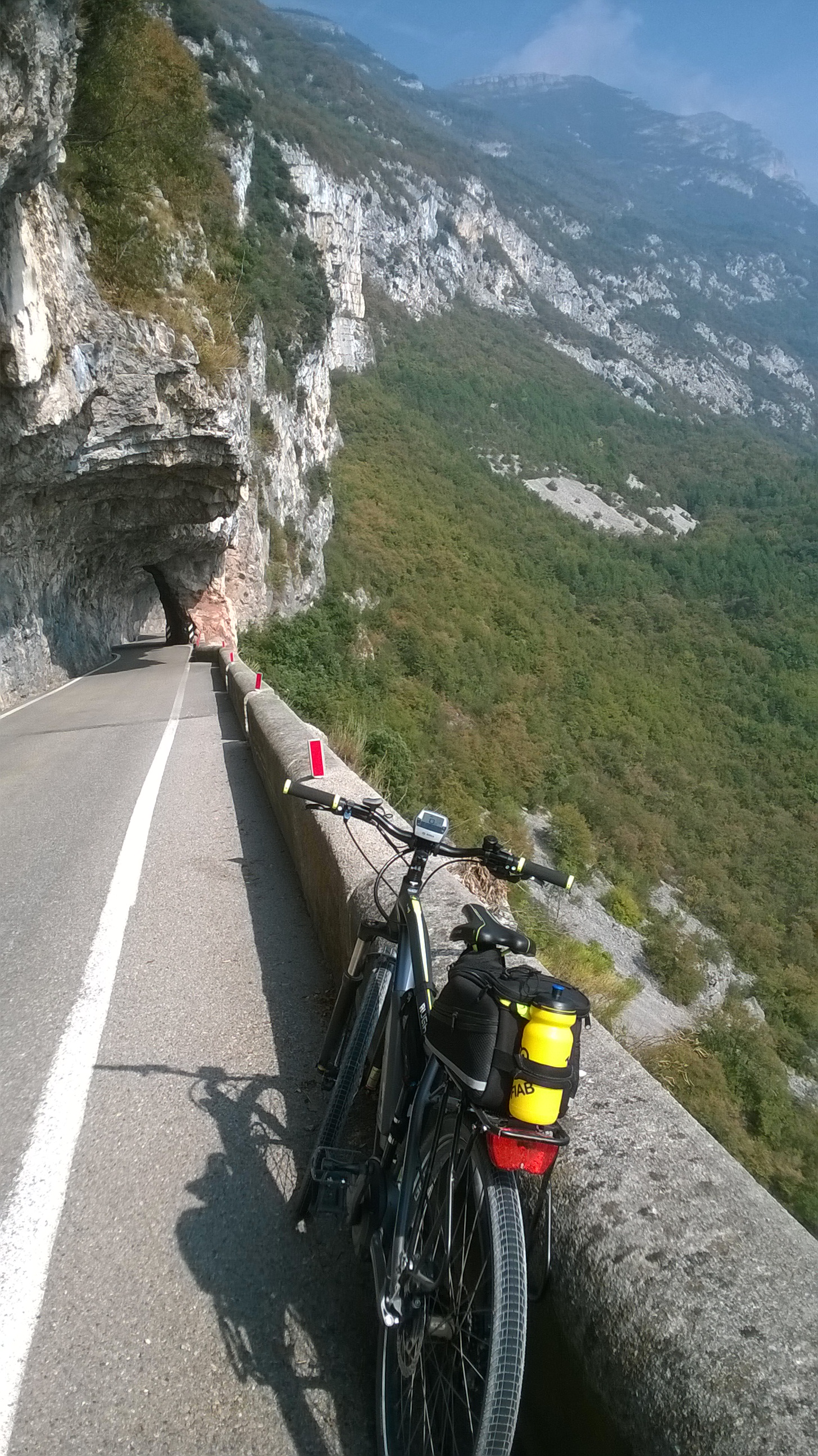 Da anni, risalendo in auto verso nord la Valle dei Laghi da Riva del Garda a Trento, notavo lontana, di fronte a me, quella strada: un taglio quasi orizzontale nel fianco della montagna, verso la Paganella. Da anni mi stavo dicendo: vai a vedere che strada è, dove porta … magari ci vai in bicicletta. Da anni …. Tanto è lì, mica scappa quella strada. Sapete come succede: quando una cosa ce l’hai a portata di mano, da un giorno all’altro rimandi e gli anni passano. Ma questa volta no. Grazie all’amico Fausto, collega Fiabbino (FIAB-Federazione Italiana Amici della Bicicletta). Mi è capitato di parlargliene. Ti ci porto io, Riccardo … dai, andiamo domani (l’invito, due giorni fa. La pedalata, ieri. N.d.r.).