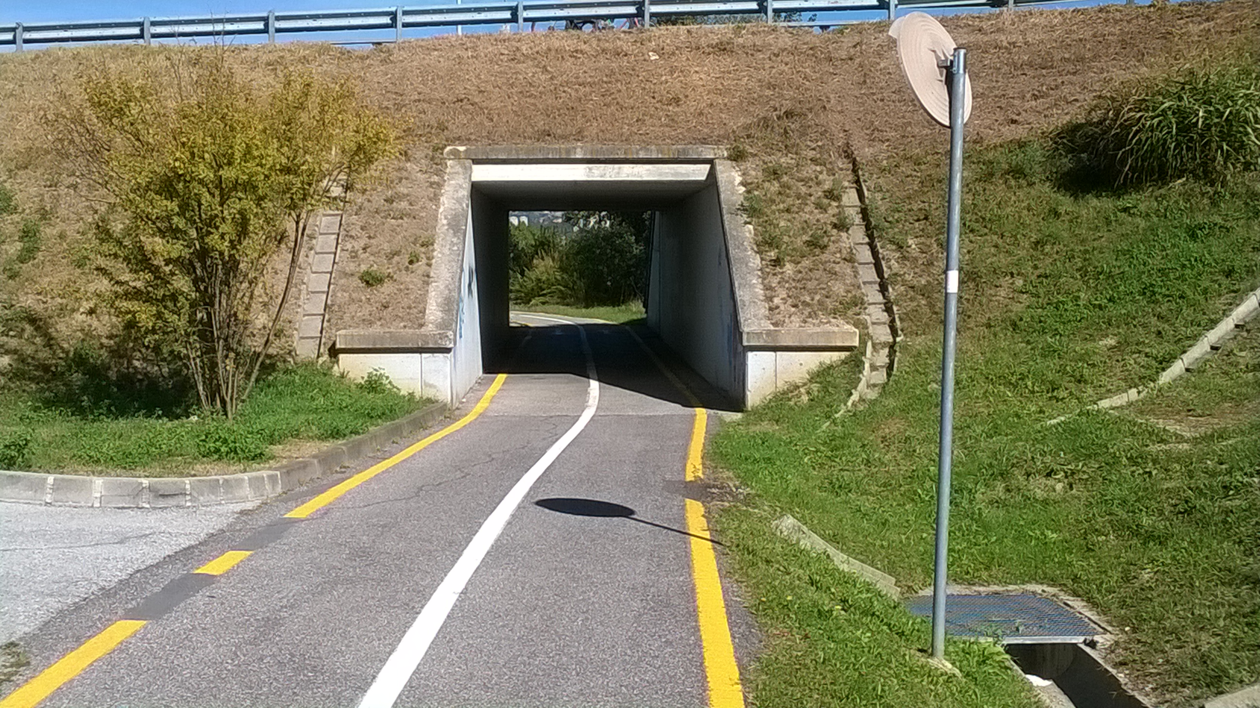 Sono sula pista. Ore 11,00. Procedo in bici da corsa verso sud, nel sottopasso ciclabile all’altezza di Mattarello nord. Improvvisamente, in una curva cieca, incrocio un furgone bianco di servizio che proviene da sud e affronta la curva invadendo le due corsie di marcia senza suonare. Me la sono cavata per un soffio, riuscendo ad infilarmi millimetricamente nello spazio fra il mezzo ed il pilastro del manufatto. Se fossi stato al centro della mia semi carreggiata o se avessi avuto una mountain bike (che ha un manubrio ben più largo) sarebbe stato un frontale! Qui sopra la foto con la visuale (nulla!) che aveva il furgone nell’affrontare il sottopasso citato: il mancato scontro è avvenuto all’uscita del tunnel, in fondo allo stesso.
