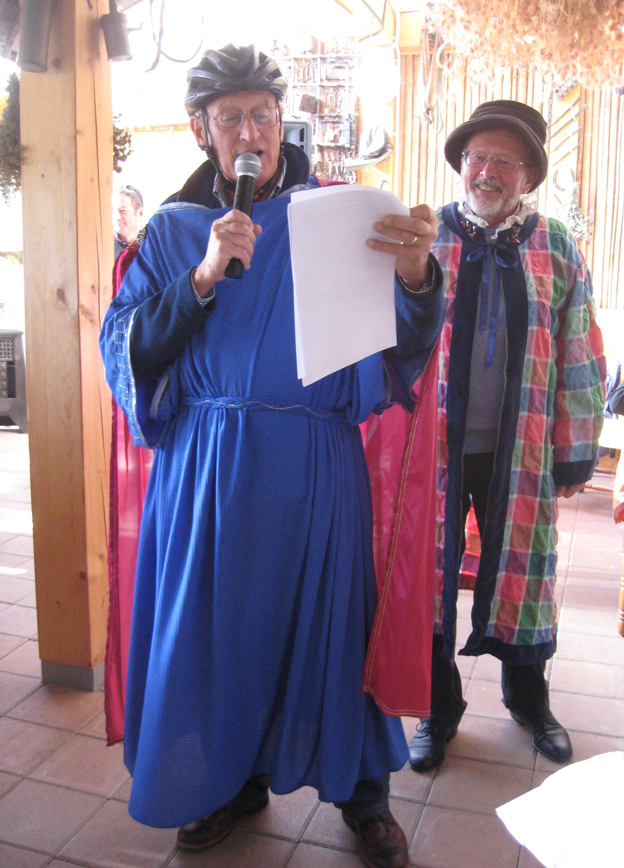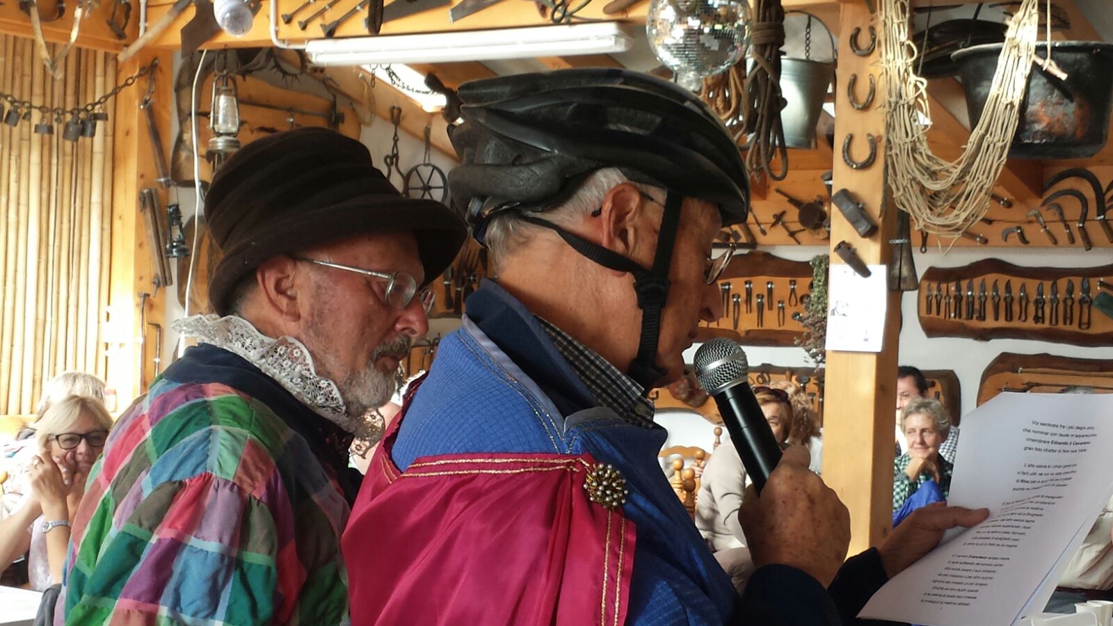 … Alt! Fermi tutti! Quale grande personaggio dei miei stivali! Ora vi dico io la verità . Intanto mi presento: son Giovanni Soncin Pedalator selvaggio, sono modenese e spesso mi capita di andare a Reggio Emilia a cercare il miglior lambrusco della terra (ne mostra una bottiglia ormai vuota). Orbene, durate una pausa di queste mie spedizioni ho visitato la Biblioteca Comunale di Reggio Emilia, la città che ha dato i natali a quel tale Ludovico Ariosto. Indagando fra i documenti storici ivi conservati, ho fatto una clamorosa scoperta, cioè che l’Ariosto, autore de l’Orlando Furioso, in realtà ha plagiato un suo predecessore, tale Riccardico Arrosto, il quale aveva composto il “Pedalando Furiosoâ€. Ho convinto quindi l’Arrosto a venire qui oggi per declamarci la sua opera.