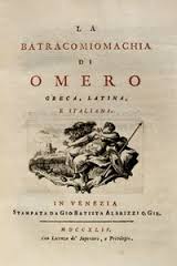 La “Batracomiomachia†(ΒατÏαχομυομαχία), la guerra fra rane e topi, è un poemetto di 303 versi di autore sconosciuto. Taluno lo fa risalire al V° secolo a. C. Il Leopardi, che ne è un famoso traduttore, al I° d. C.. Vi si narra di una guerra, durata un giorno, fra il popolo dei topi e quello delle rane. Una banalità , potrebbe dire taluno. Si, se banalità fosse anche il Pinocchio, cosa che non è. Csstigat ridendo mores … i costumi letterari e del pensiero. L’autore è persona colta che scrive per lettori colti, i quali siano in grado di capire la smitizzazione che egli fa del poema epico; ed anche per lettori non colti, che possono essere avvicinati alla lettera da questi versi, pochi (ma non troppo) “ scherzucci di dozzina, per dirla con il Giusti.